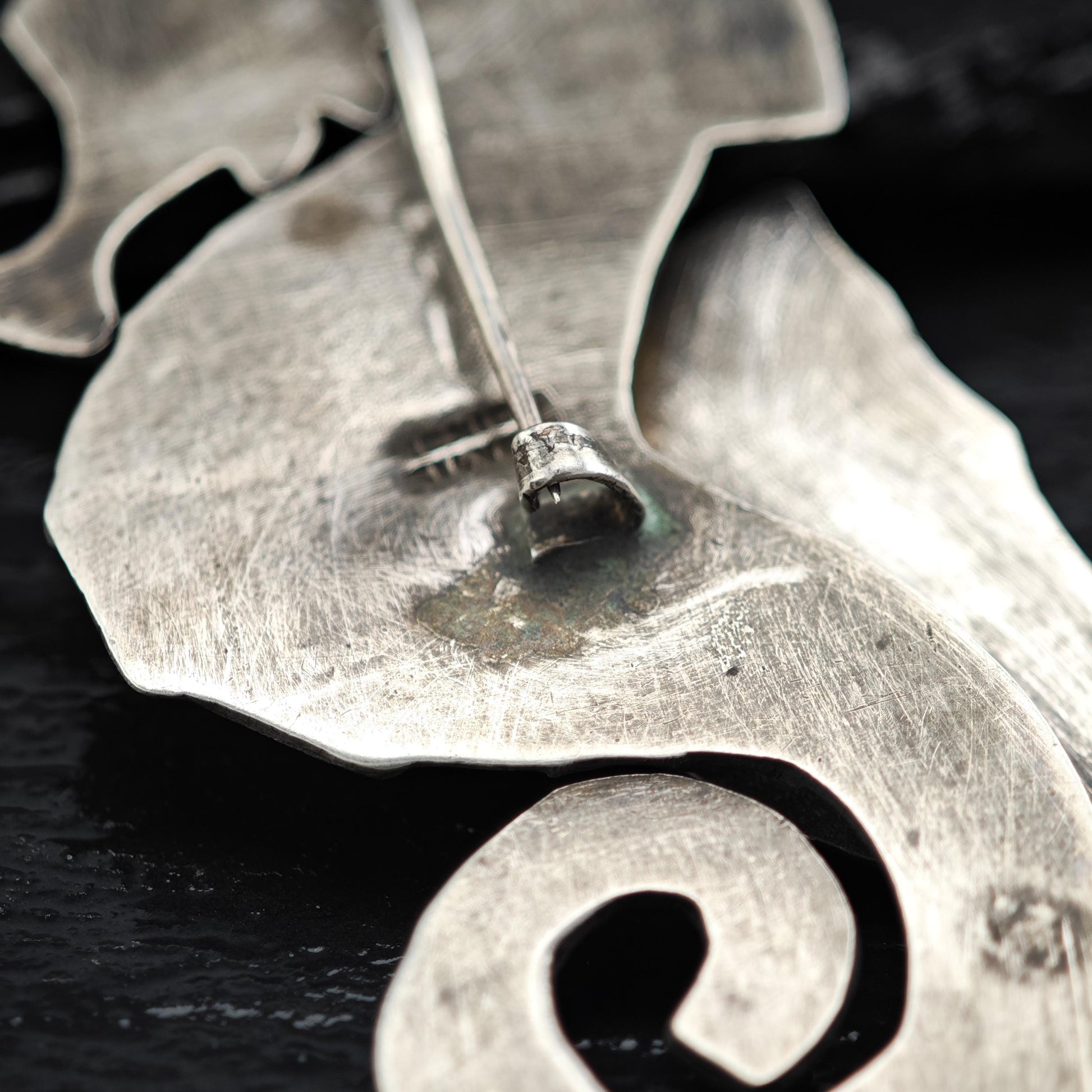 Please note that variations in color in the photos are due to reflections; in person, the brooch exhibits a beautiful, even silver tone, with hints of gold where applicable.