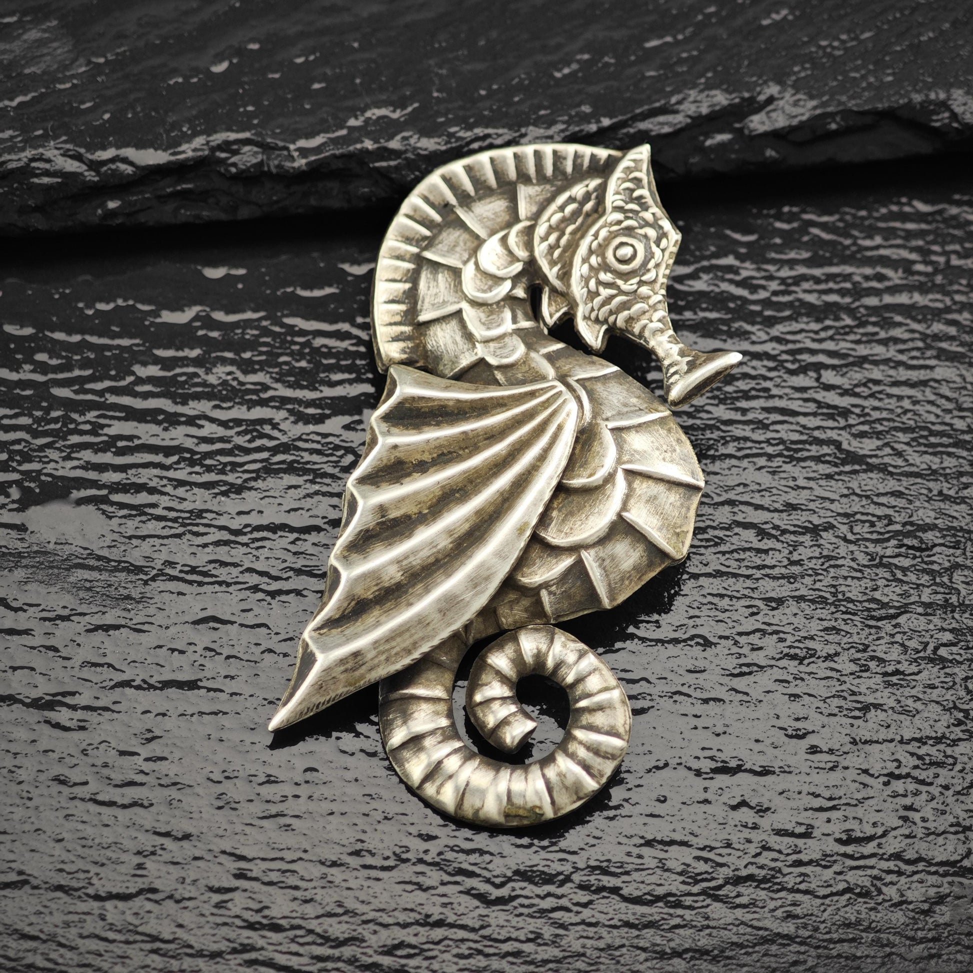 The brooch features an intricately designed seahorse, showcasing the artistry of Mexican silverwork. It is marked "Mexico Silver," and has been tested and guaranteed to be genuine sterling silver. The condition is good, with light cleaning and a moderate patina that reflects its age, adding to its character.