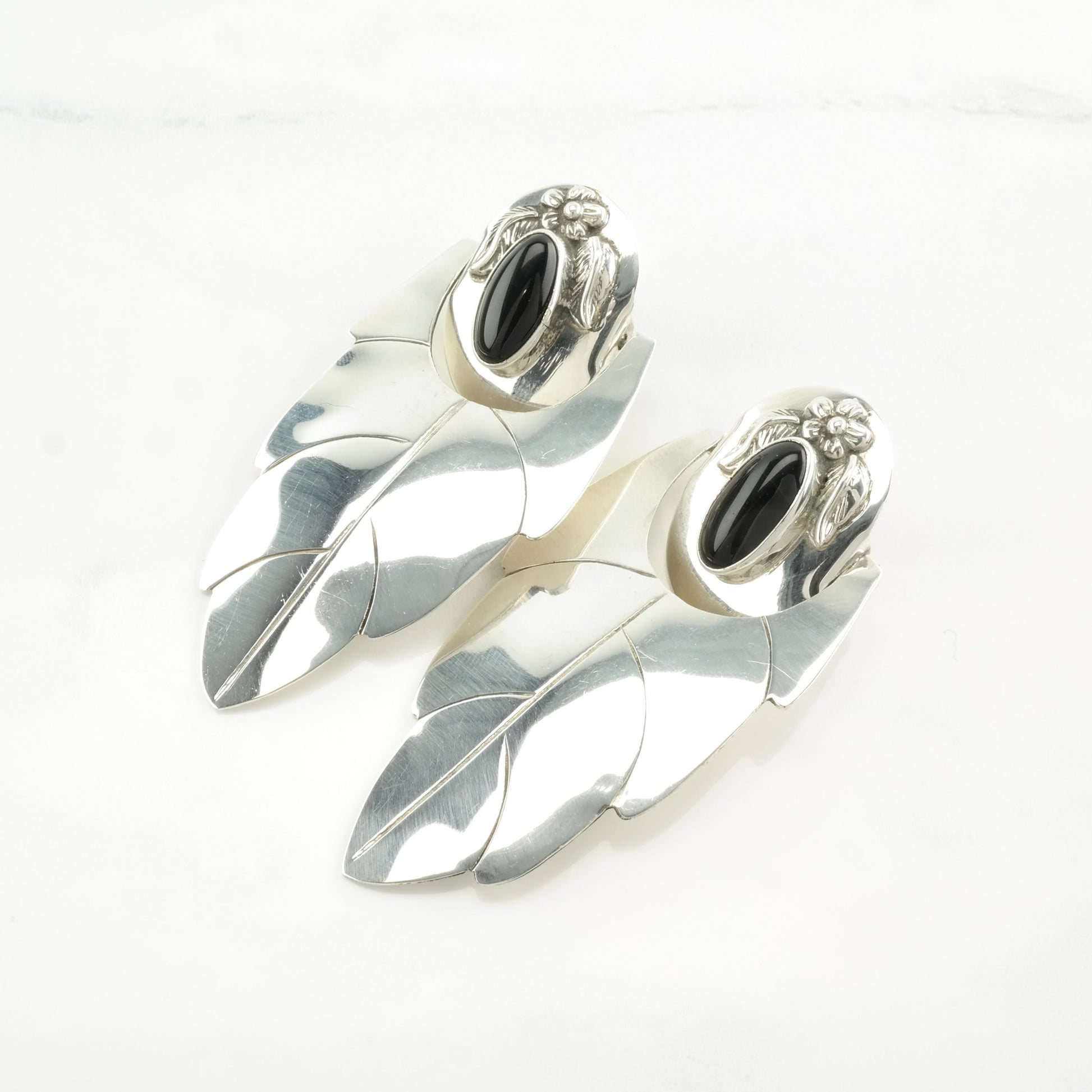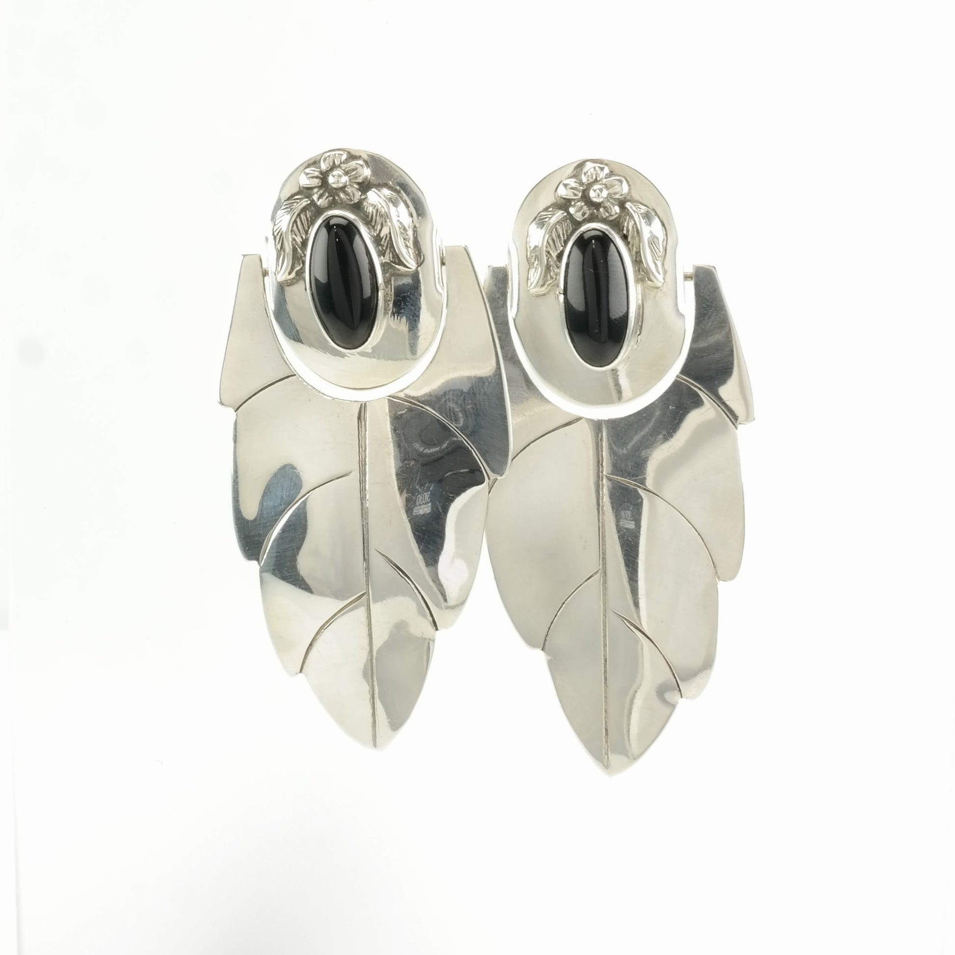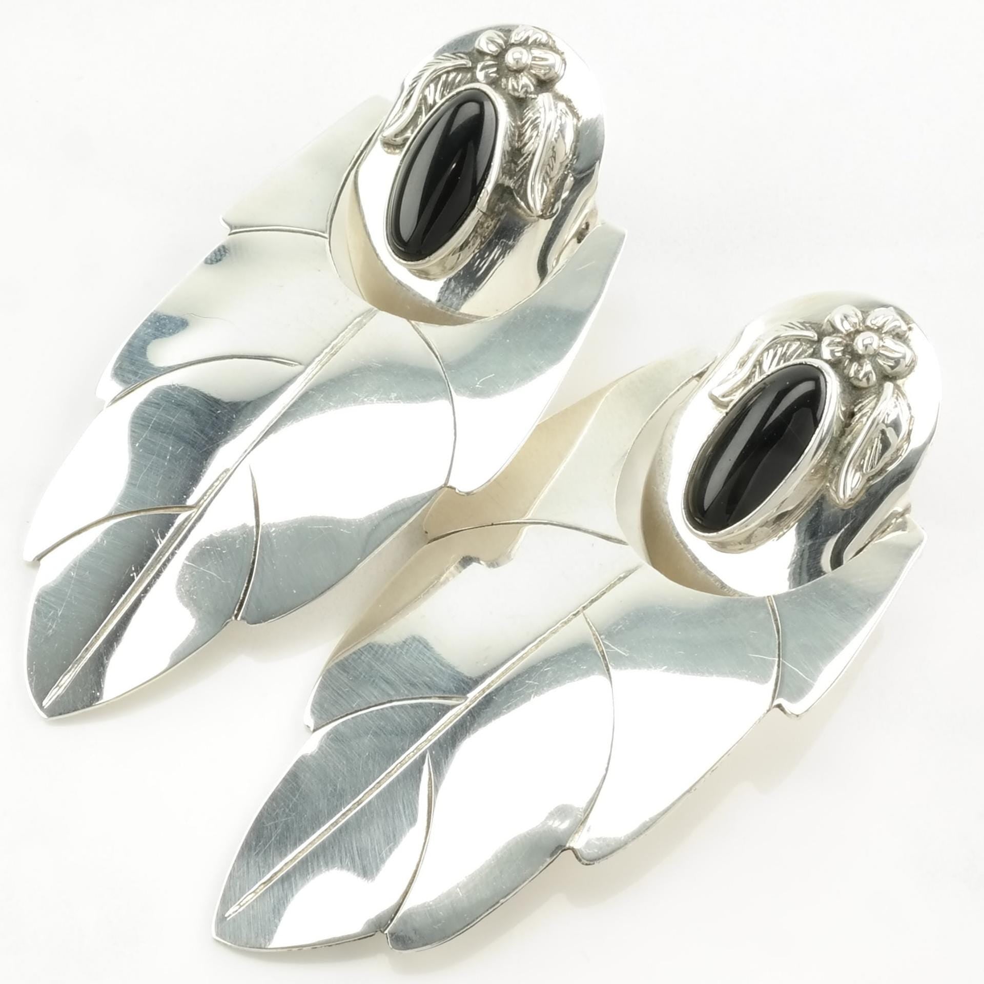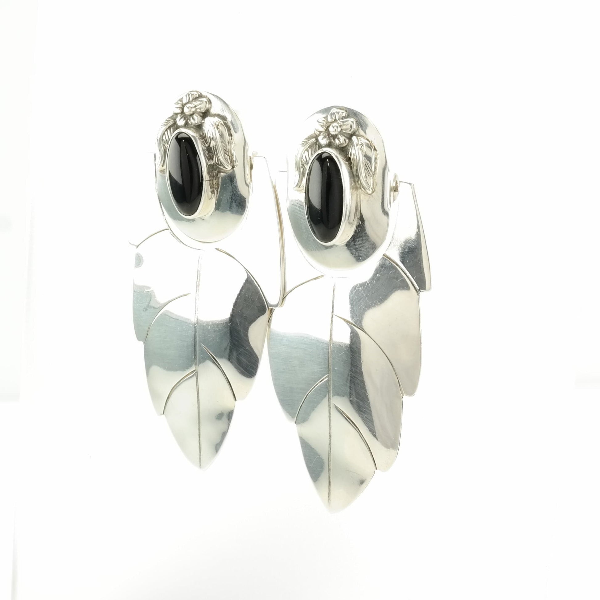 Vintage Sterling Silver Stud, dangle Earrings Large Black Onyx Feather, Floral