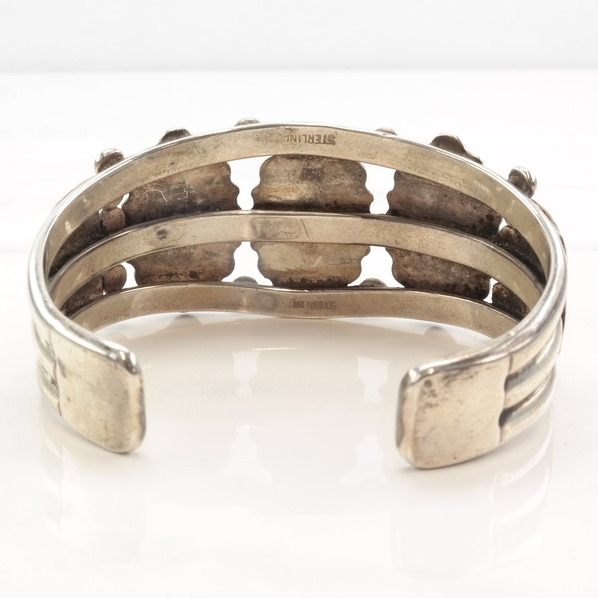 Transport yourself back to the free-spirited 1970s with this stunning vintage sterling silver and turquoise cuff bracelet! This substantial piece features three vibrant turquoise cabochons in a unique swirl pattern, each with its own distinct character and matrix. The silverwork is equally impressive, with intricate stamped details and a gently curved shape that hugs the wrist comfortably.