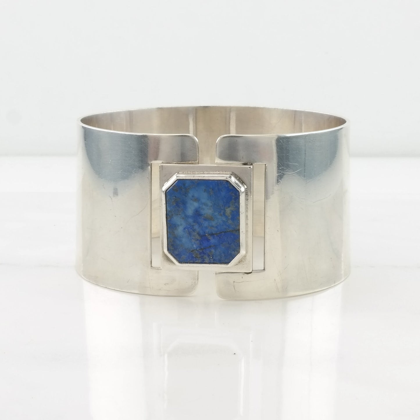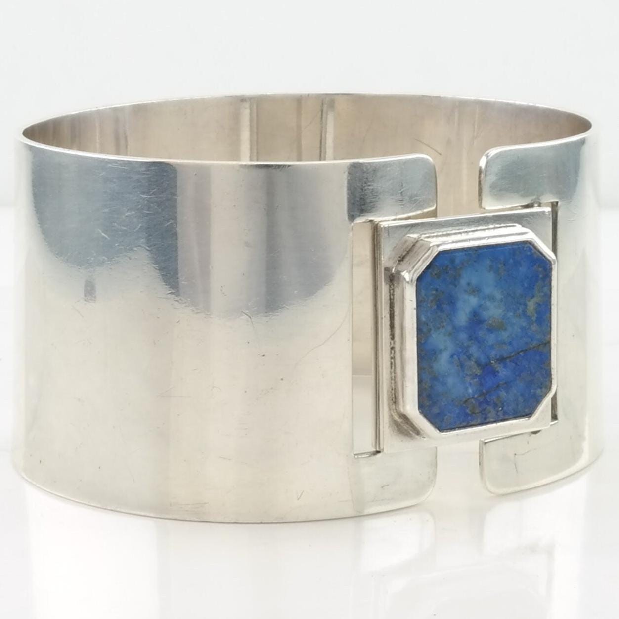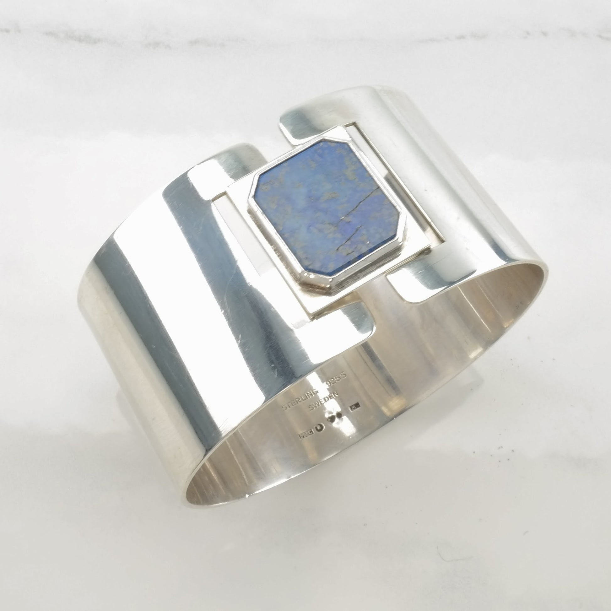 Vintage Sweden Sterling Silver Bangle Bracelet Blue Lapis Lazuli Wide, Modernist