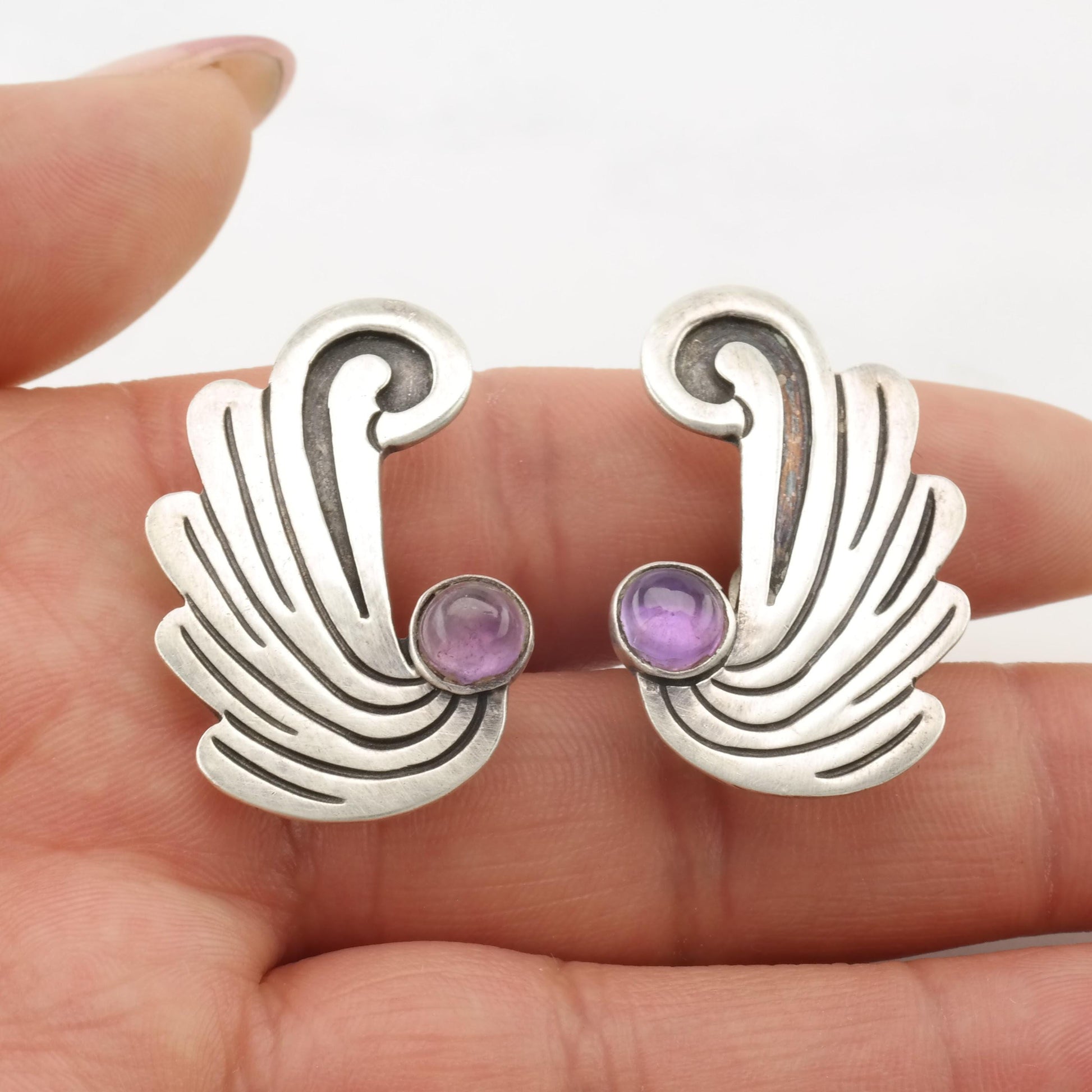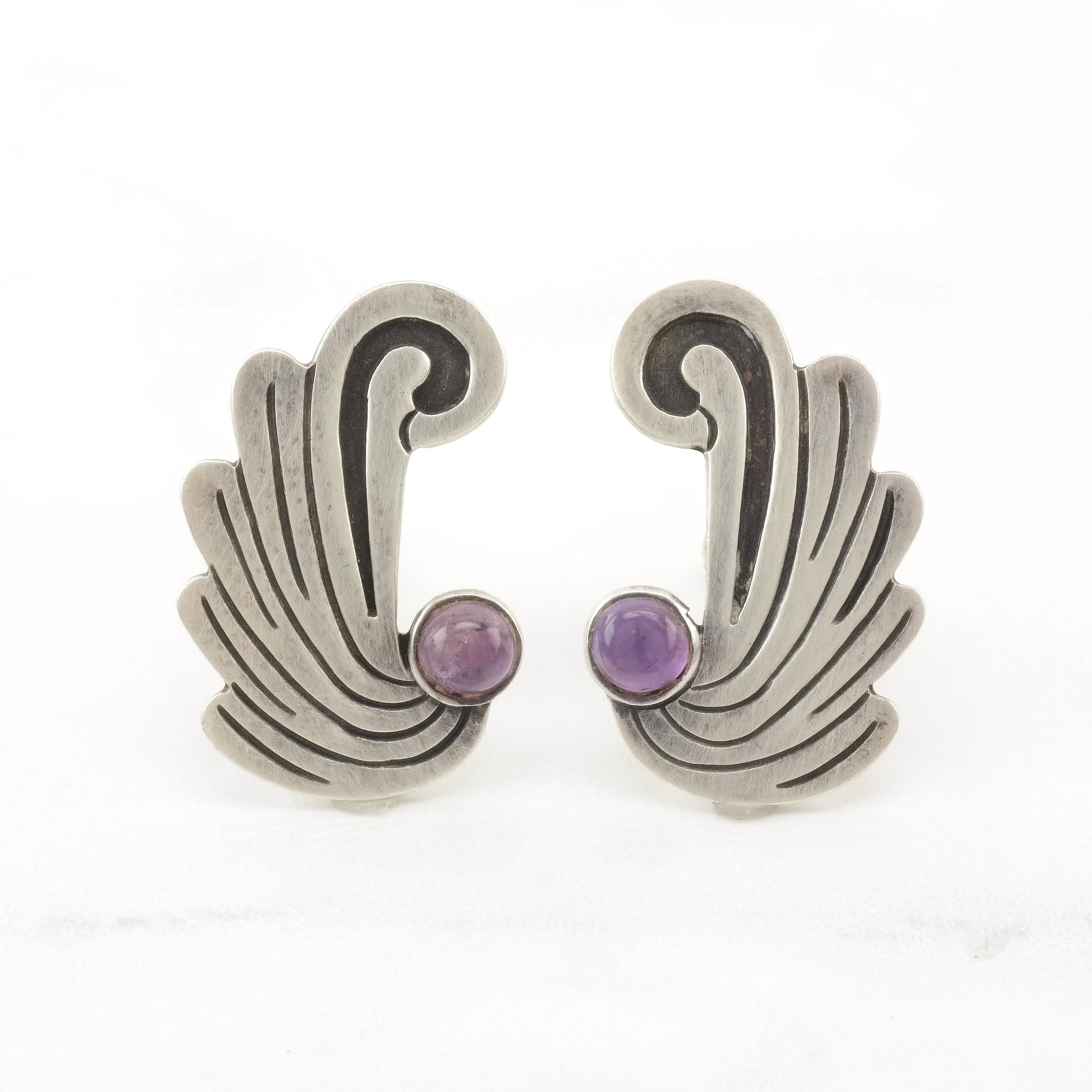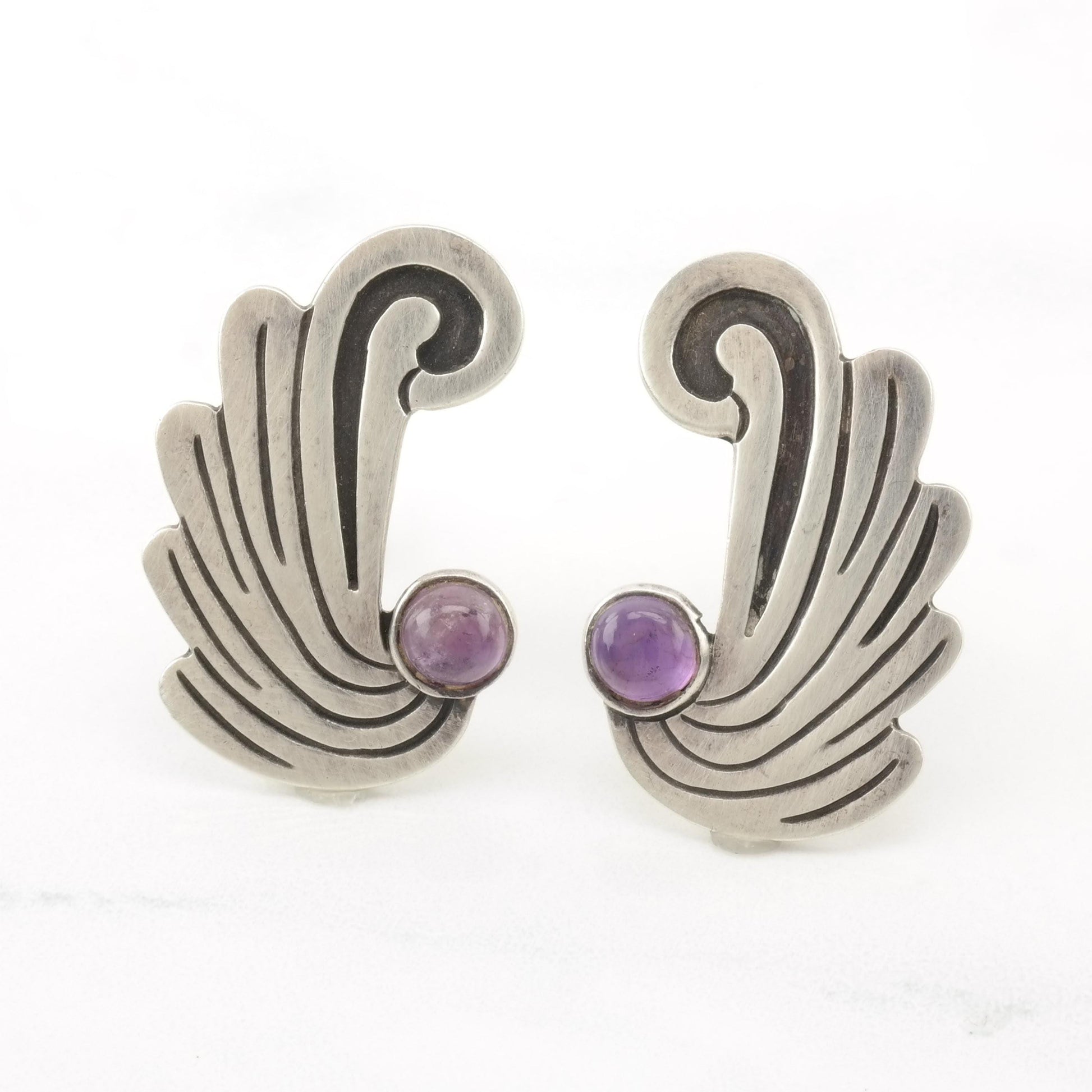 Vintage Taxco Amethyst Sterling Silver Screw Back Earrings Wings or Waves