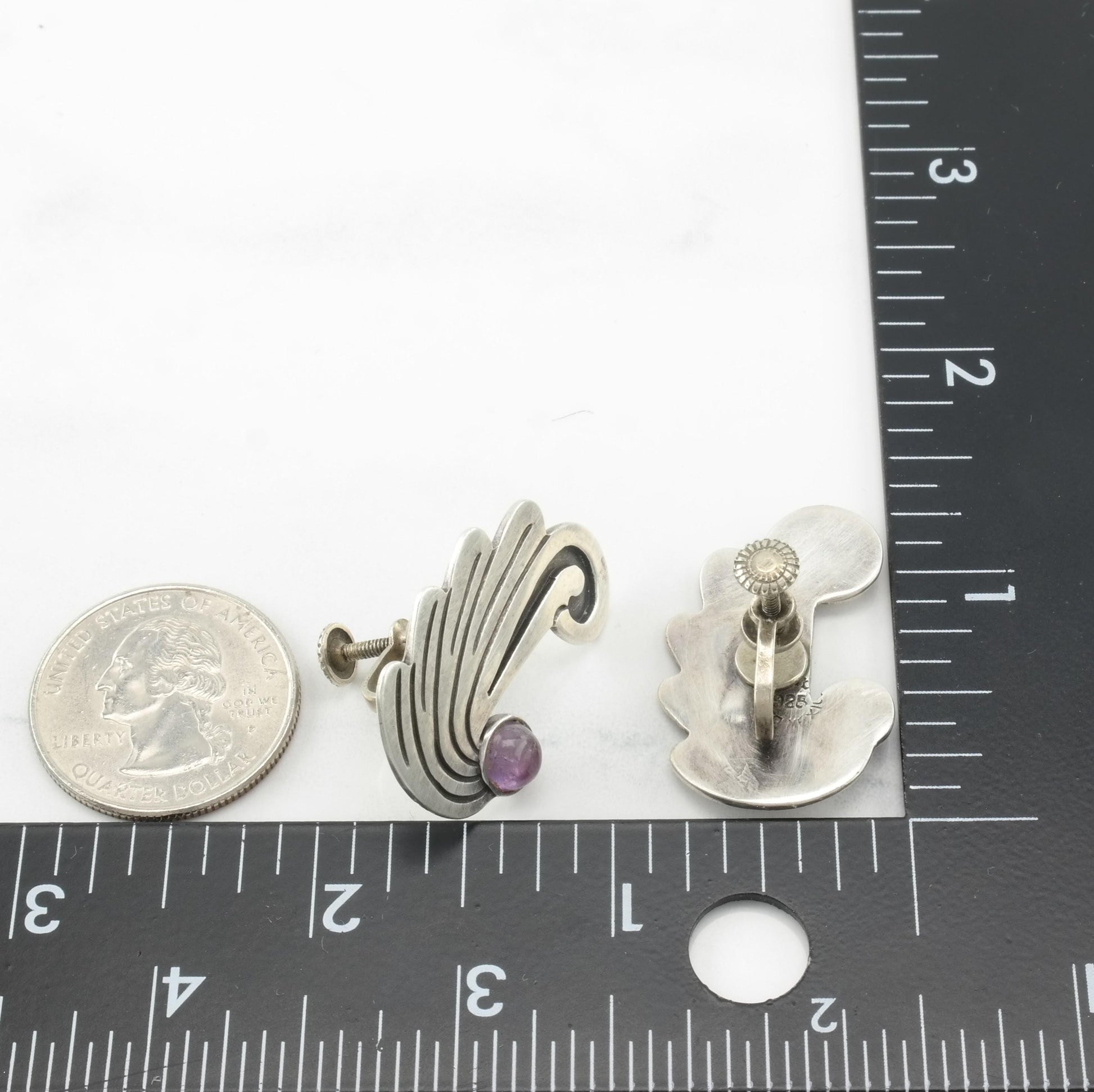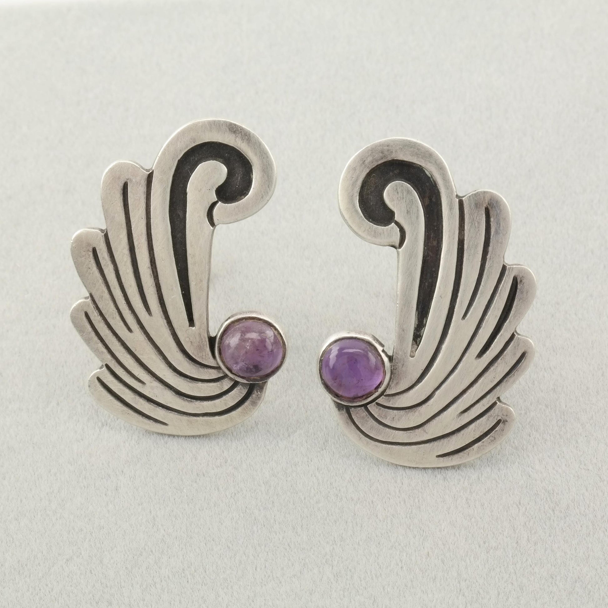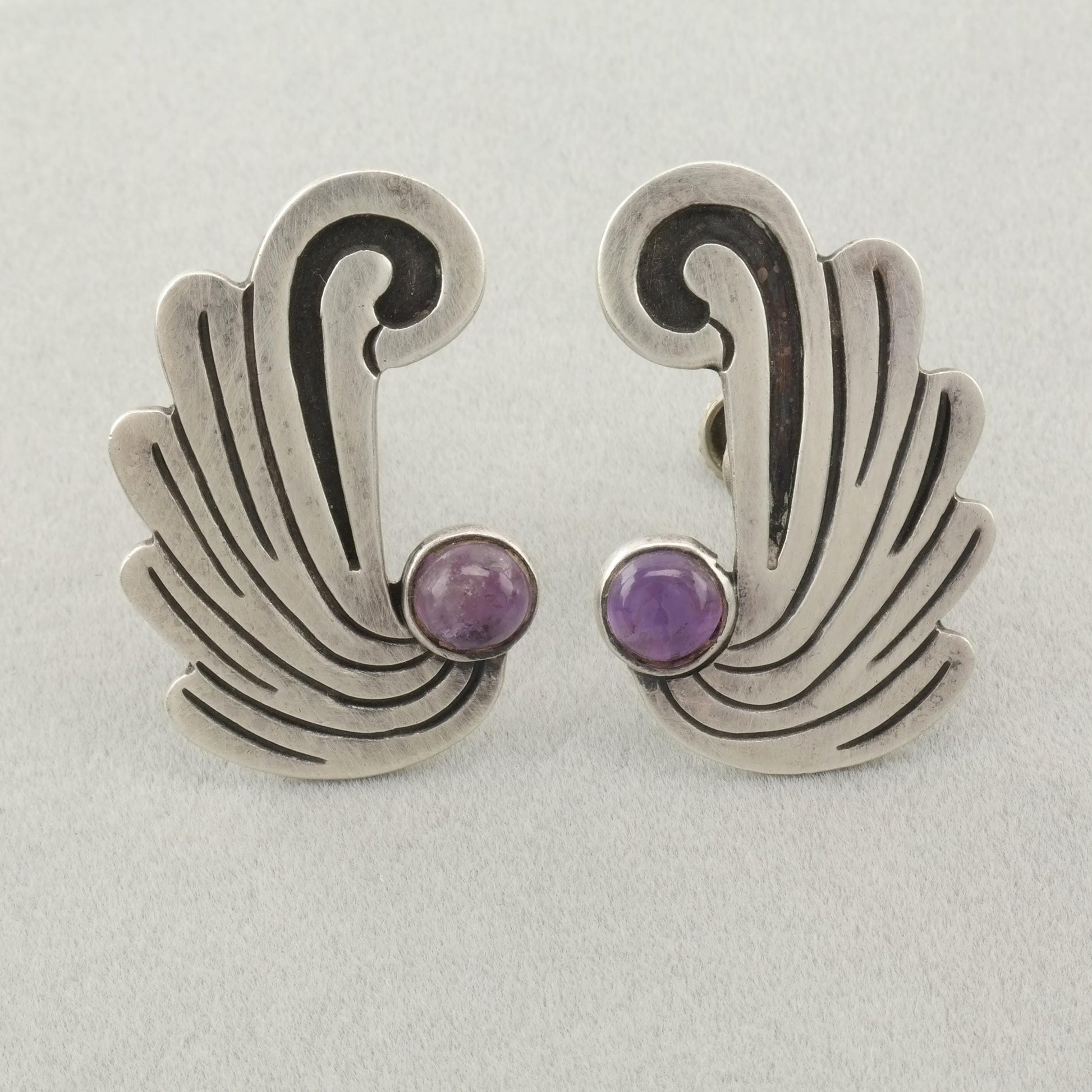 Vintage Taxco Amethyst Sterling Silver Screw Back Earrings Wings or Waves