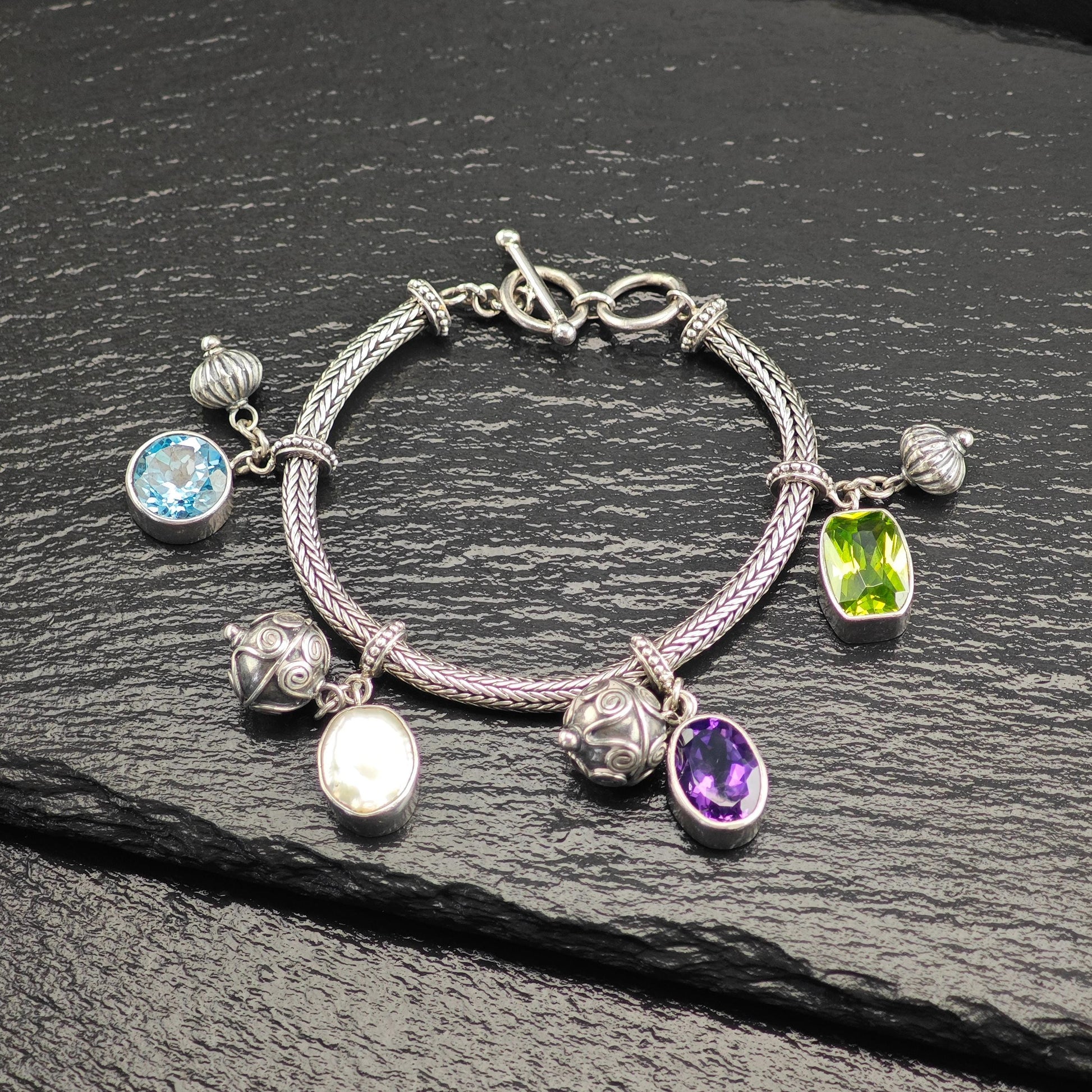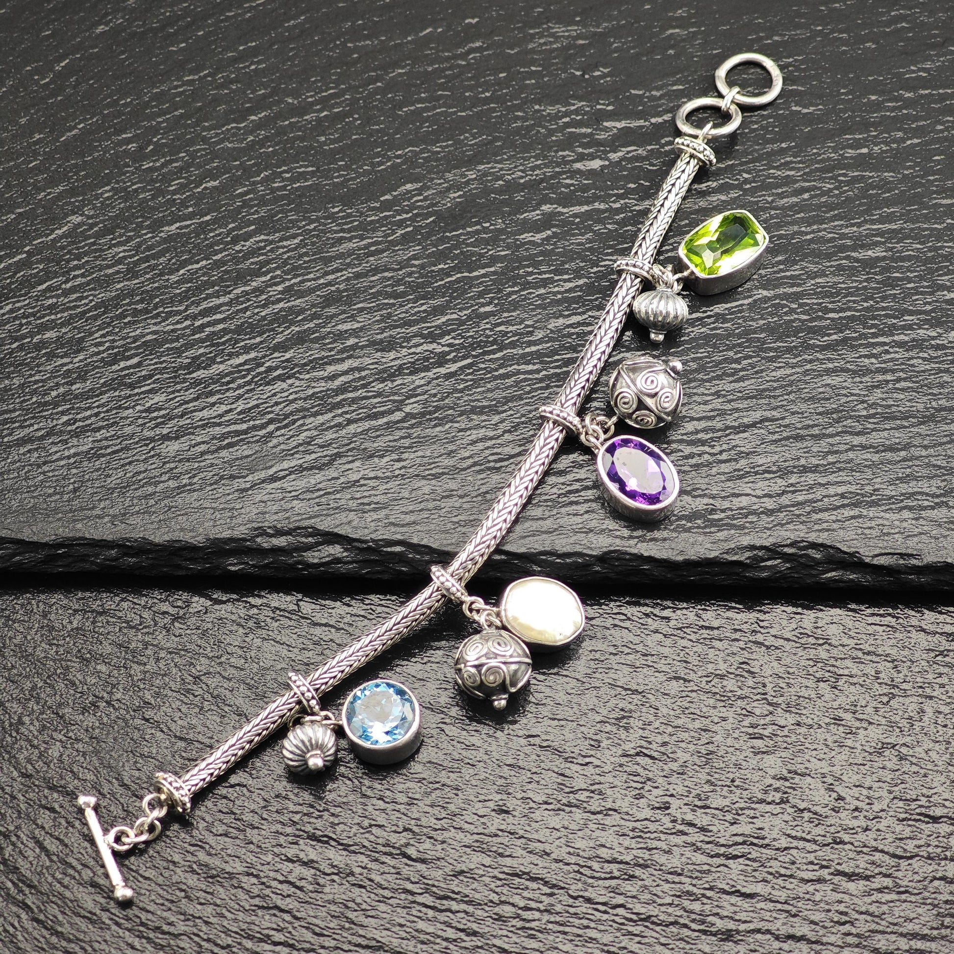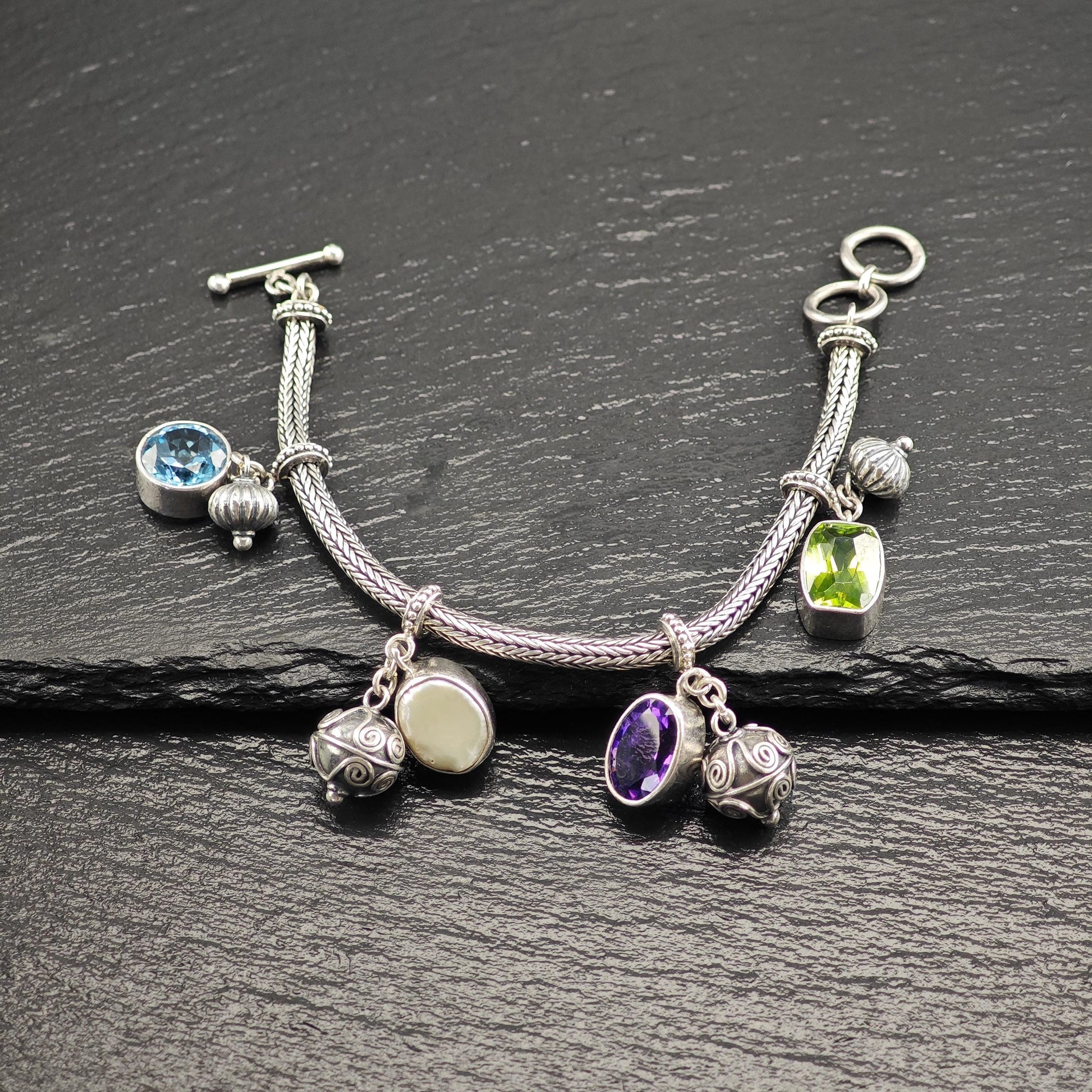 Vintage Topaz, Amethyst, Pearl, Charm Bracelet Sterling Silver