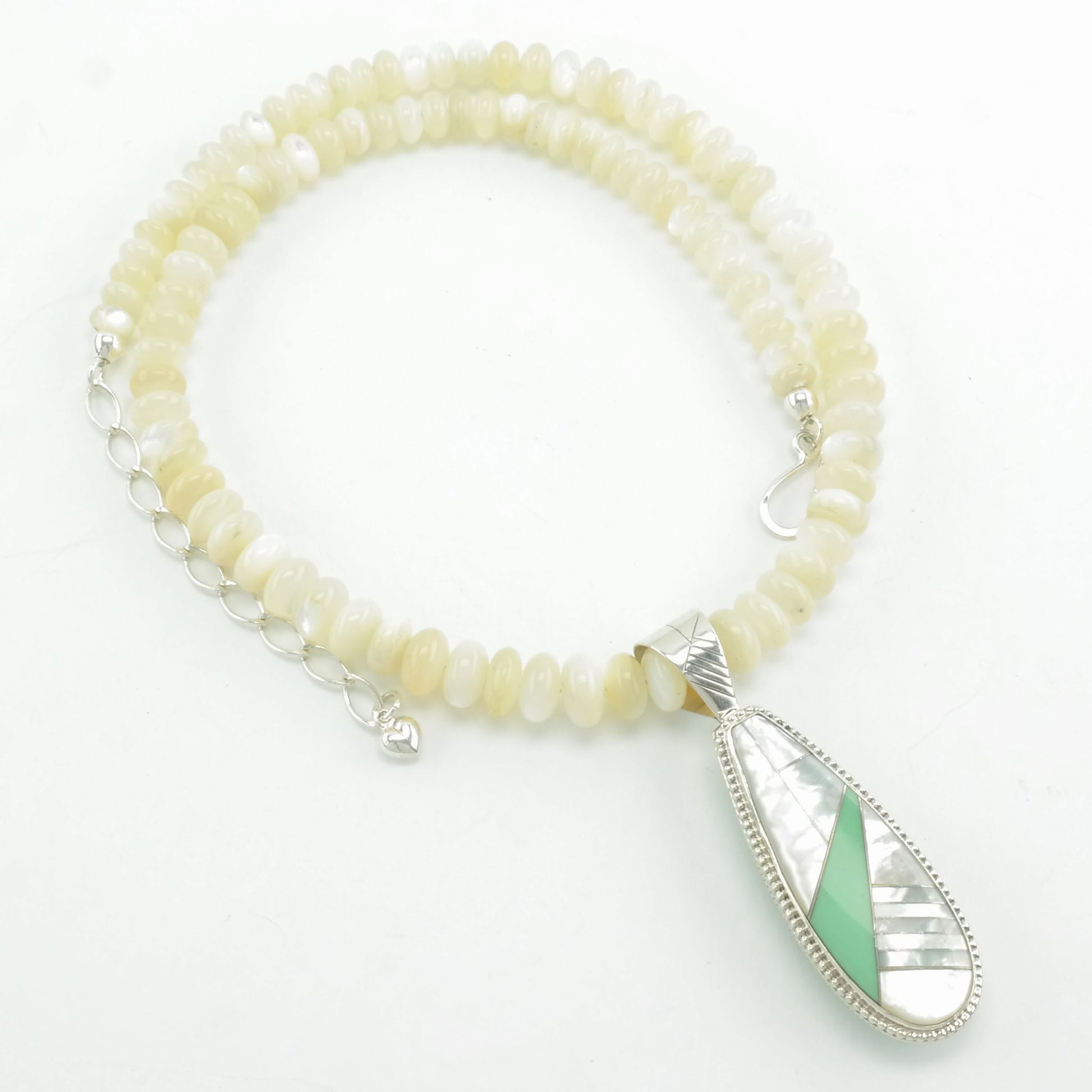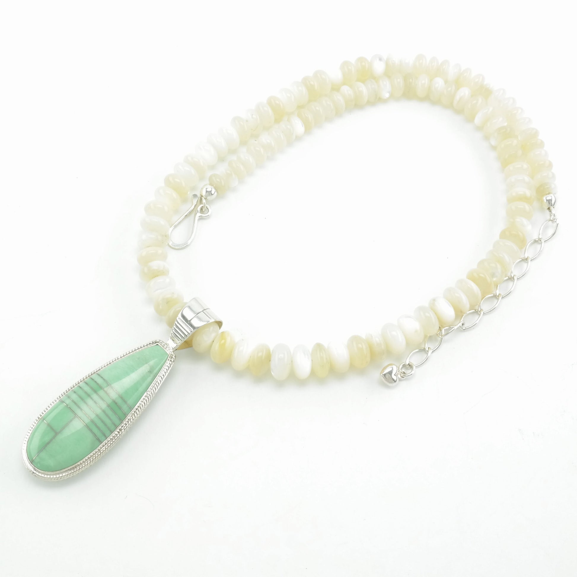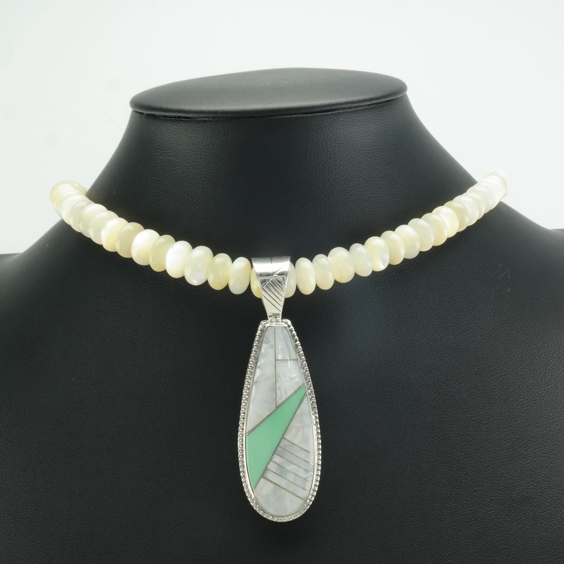 Vintage Sterling Silver Green, Iridescent, White Turquoise, MOP Inlay, Bead, Reversible Necklace