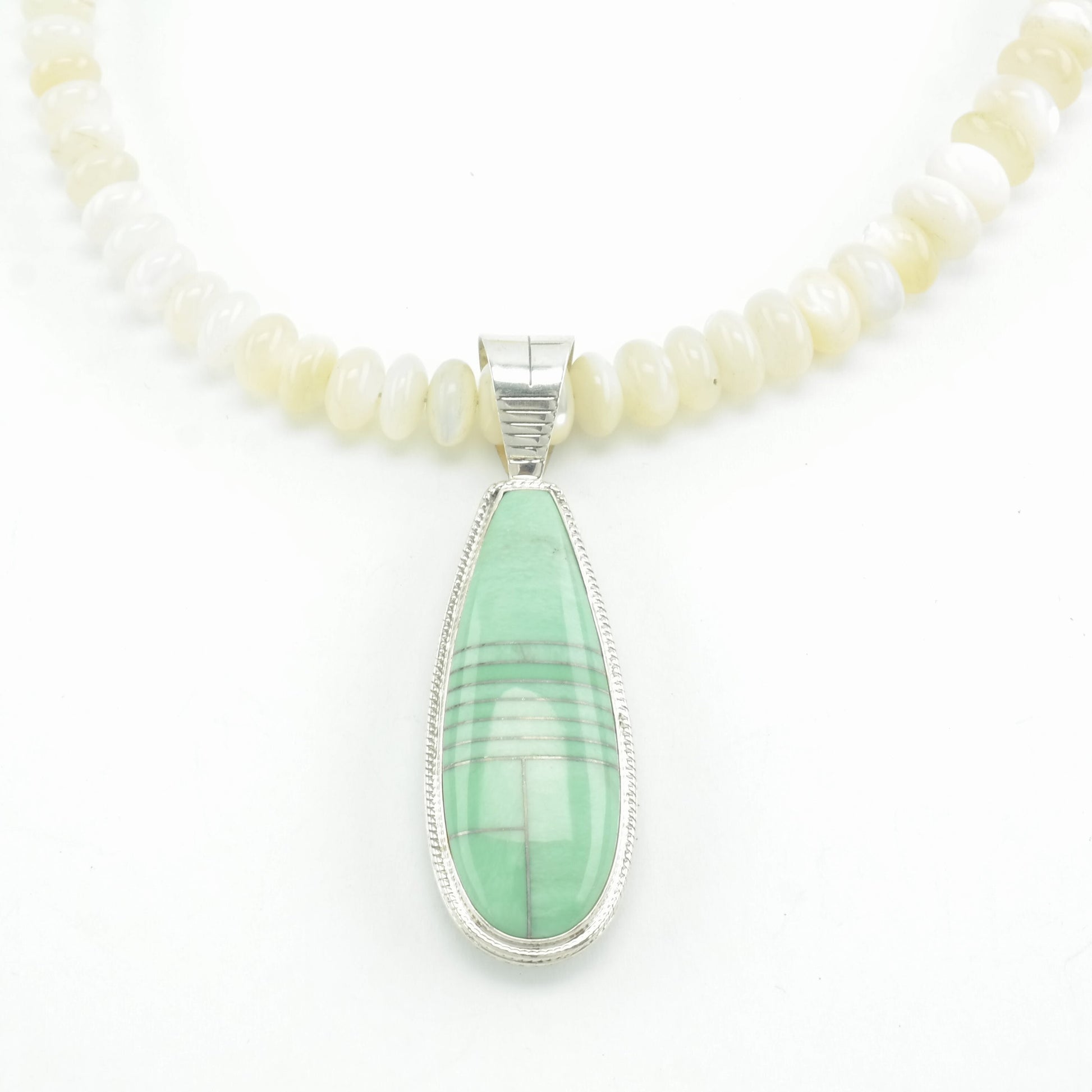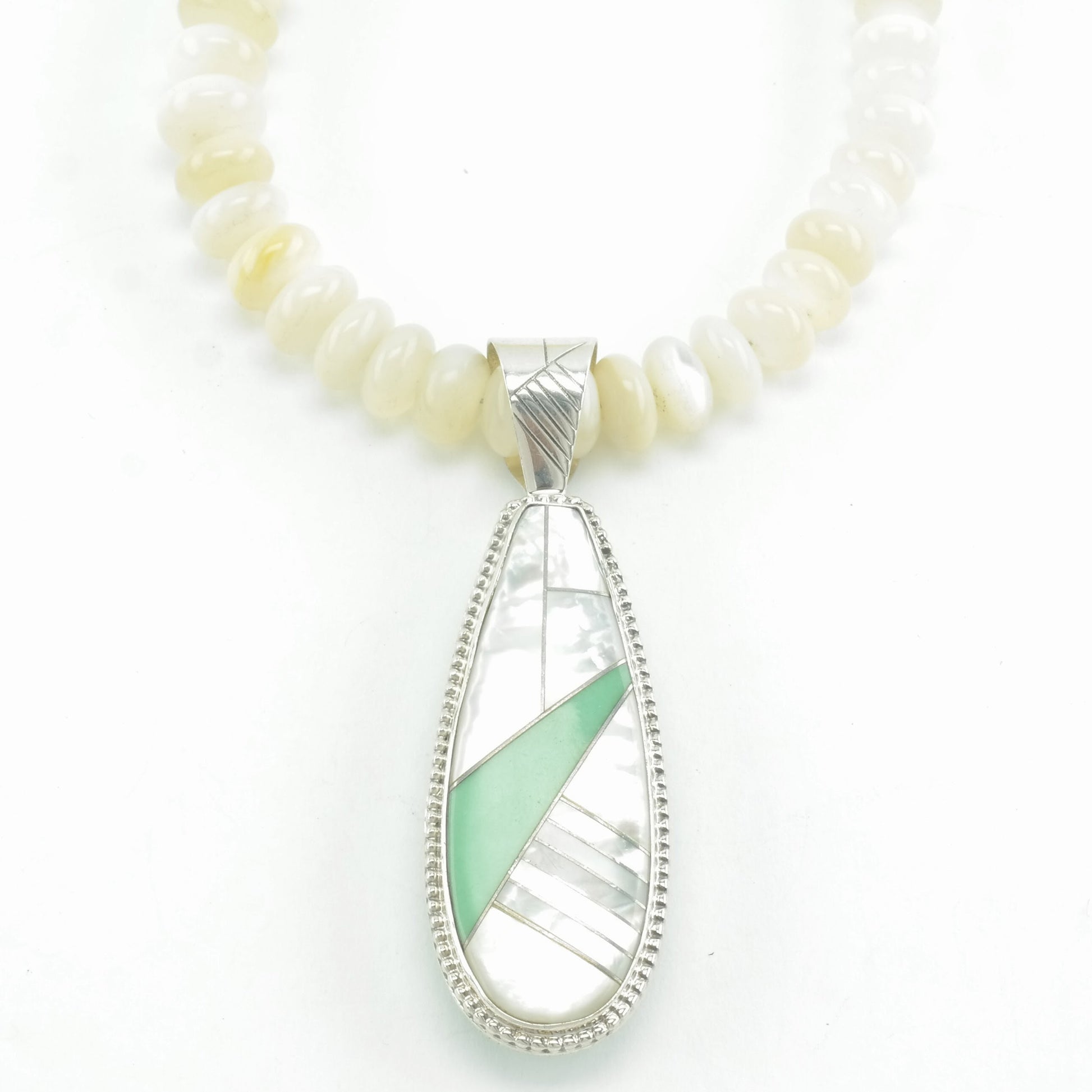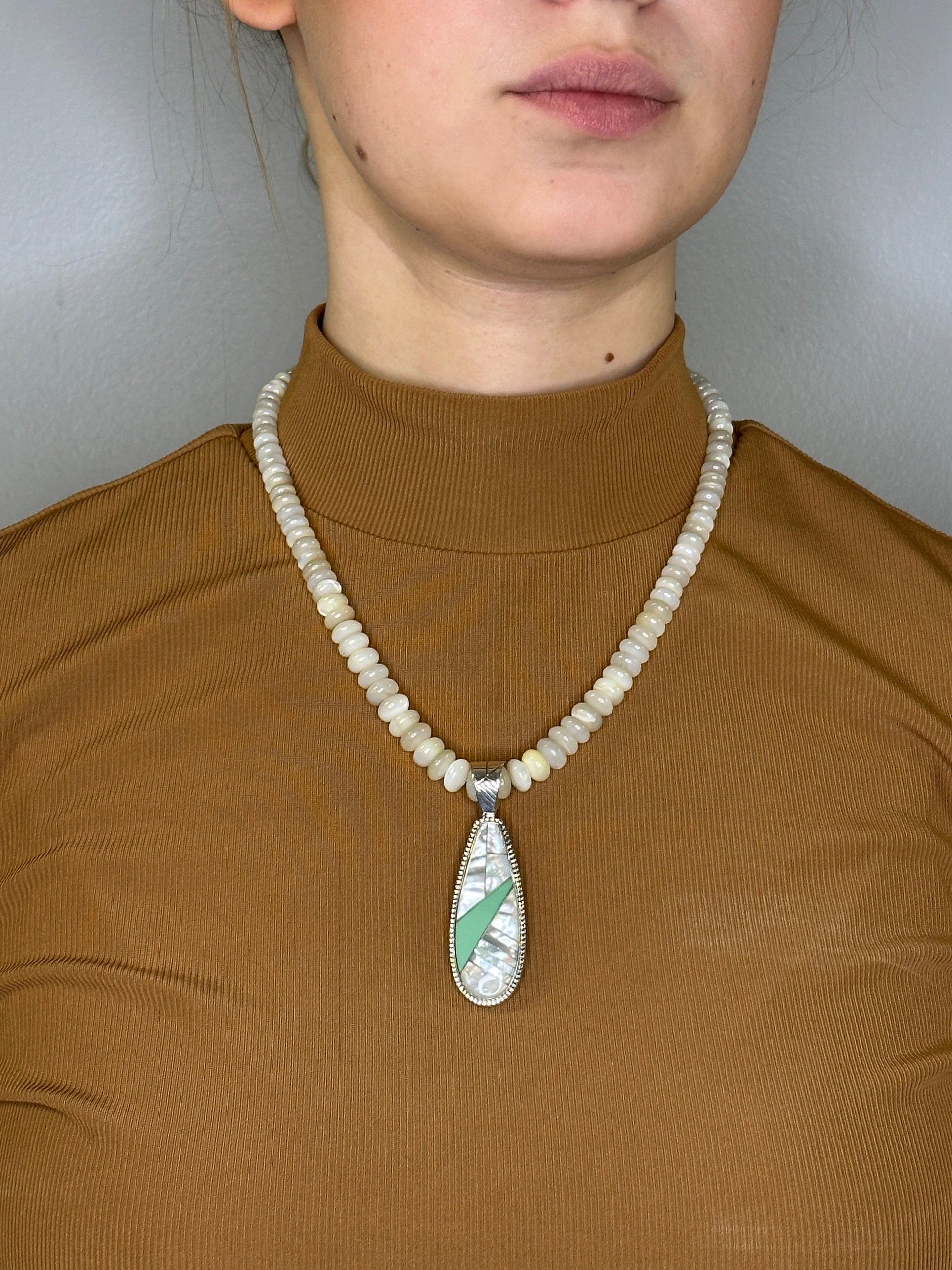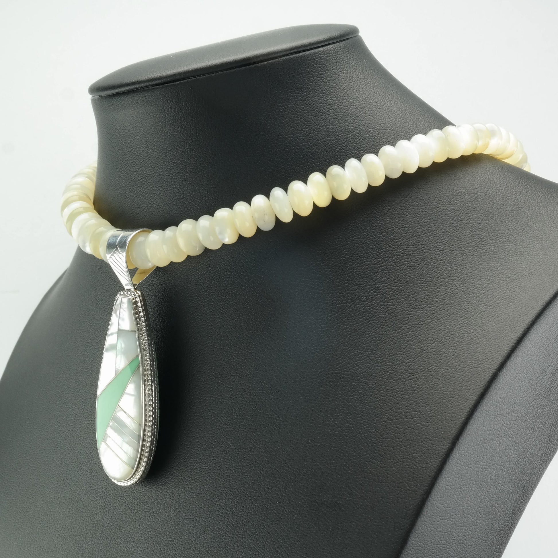 Vintage Sterling Silver Green, Iridescent, White Turquoise, MOP Inlay, Bead, Reversible Necklace