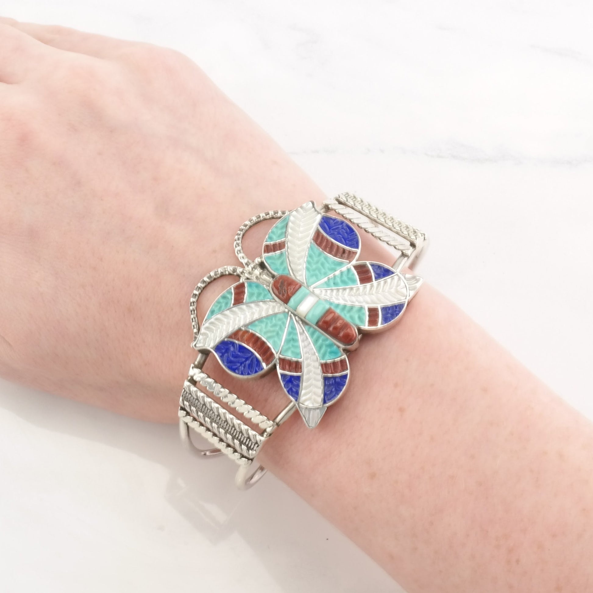 Vintage Zuni Inlay Butterfly Cuff Bracelet Native American Sterling Silver Carved Turquoise