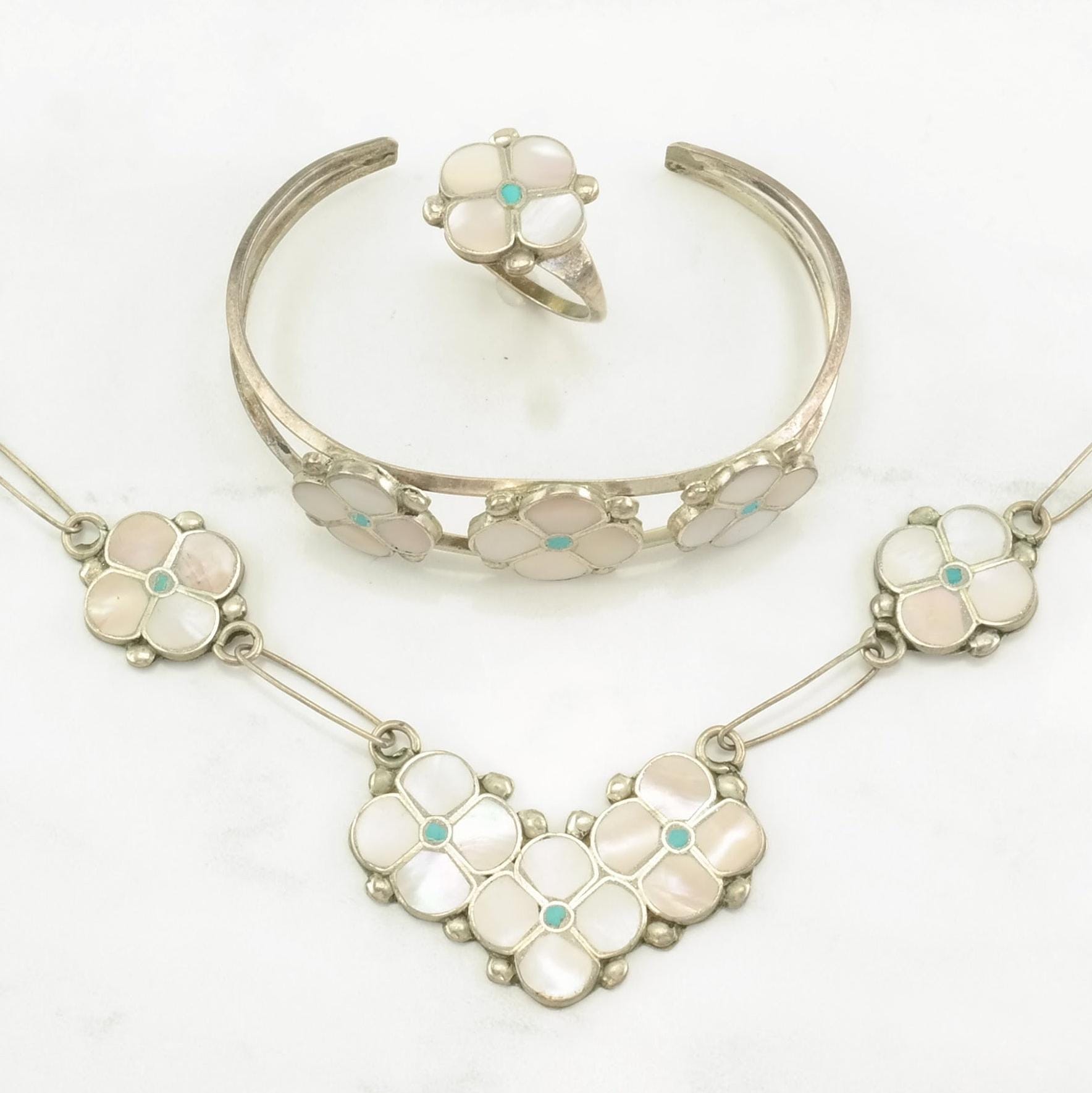 Vintage Native American MOP, Turquoise, Floral Inlay Sterling Silver Cuff, Necklace, Ring Set