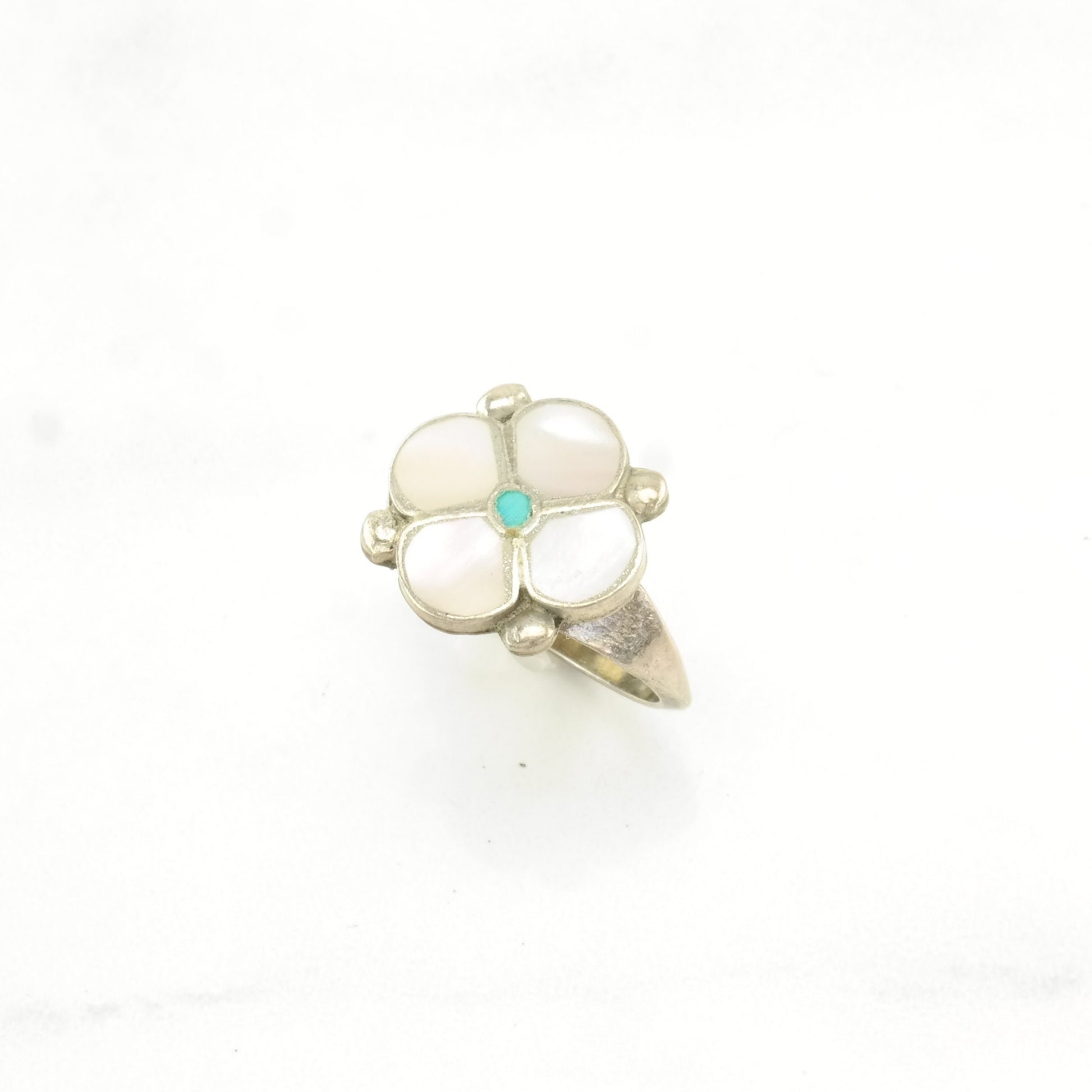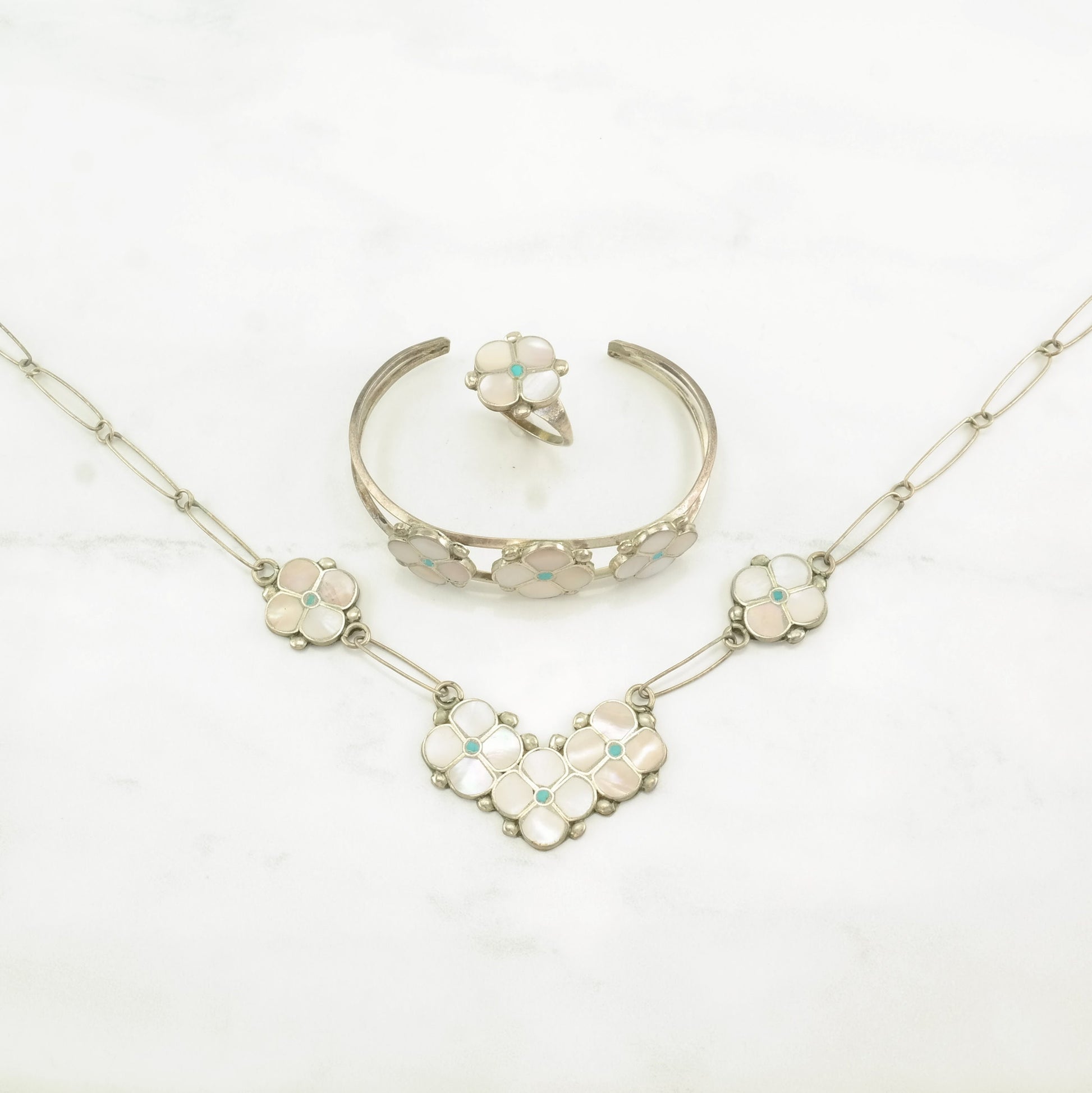 Vintage Zuni Native American MOP, Turquoise, Floral Inlay Sterling Silver Cuff, Necklace, Ring Set