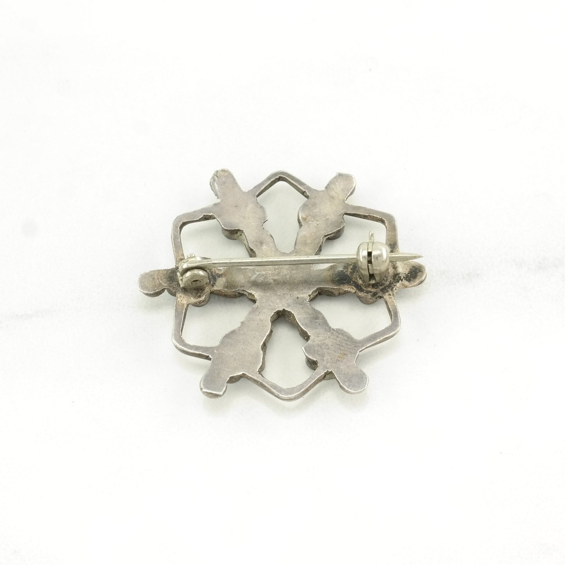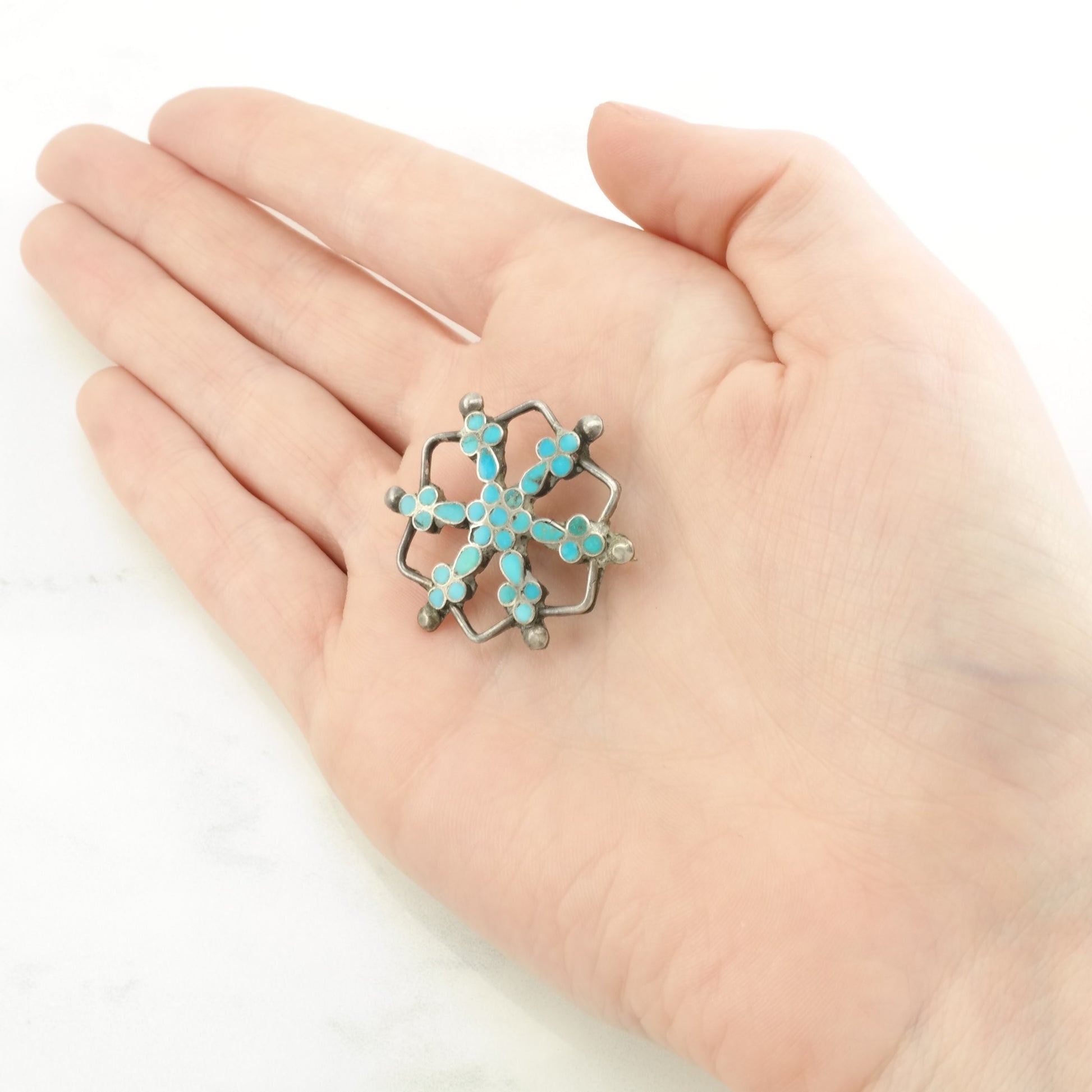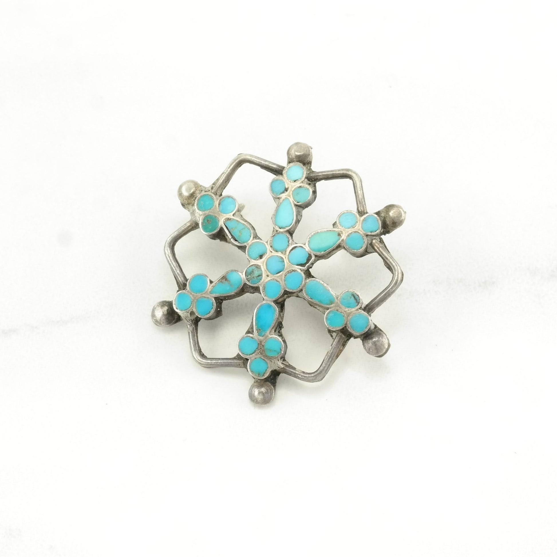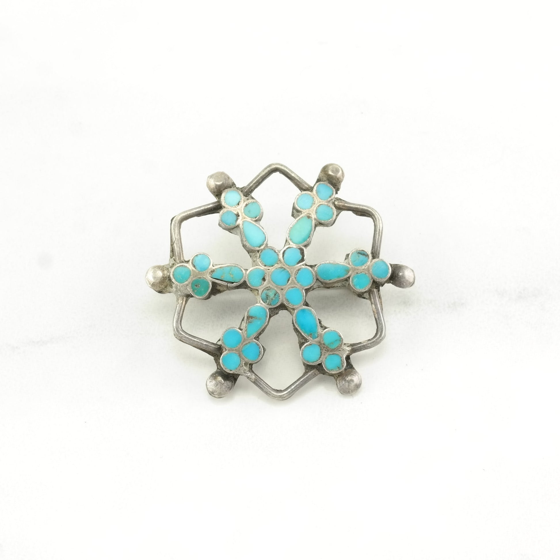 Vintage Zuni, Native American Sterling Silver Brooch Inlay, Snowflake Blue Turquoise