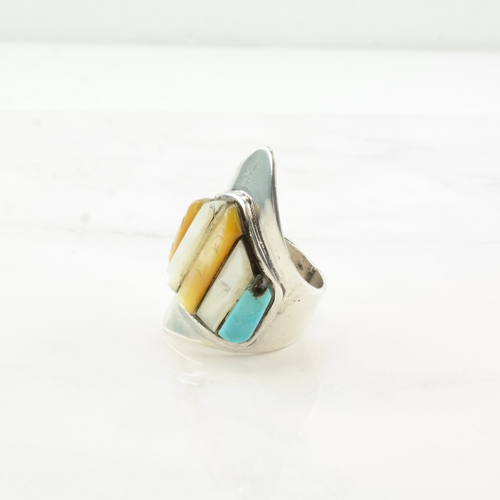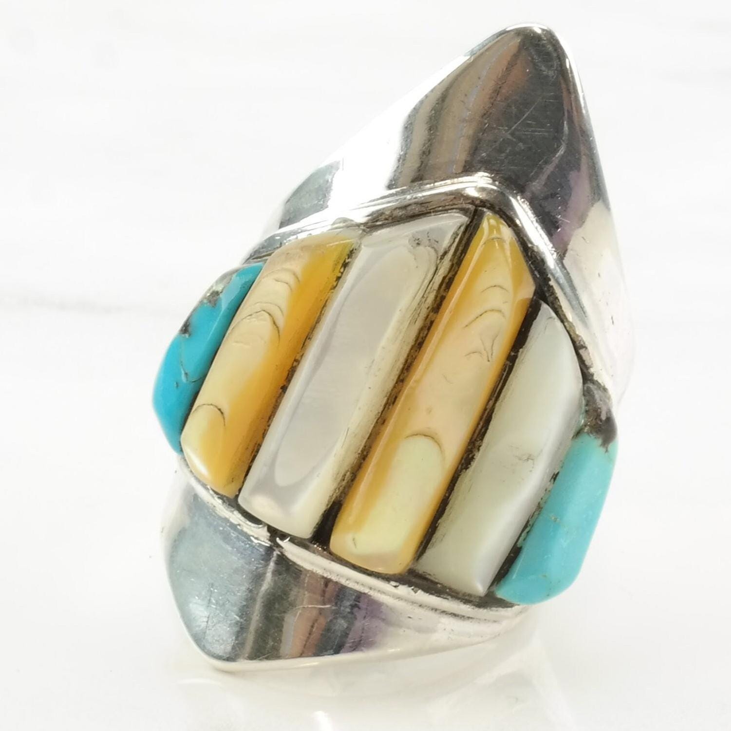 Vintage Zuni Silver Ring MOP Turquoise Cobblestone Inlay Sterling Size 9 3/4