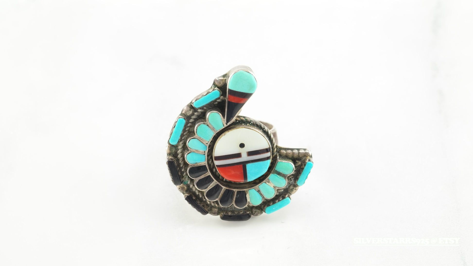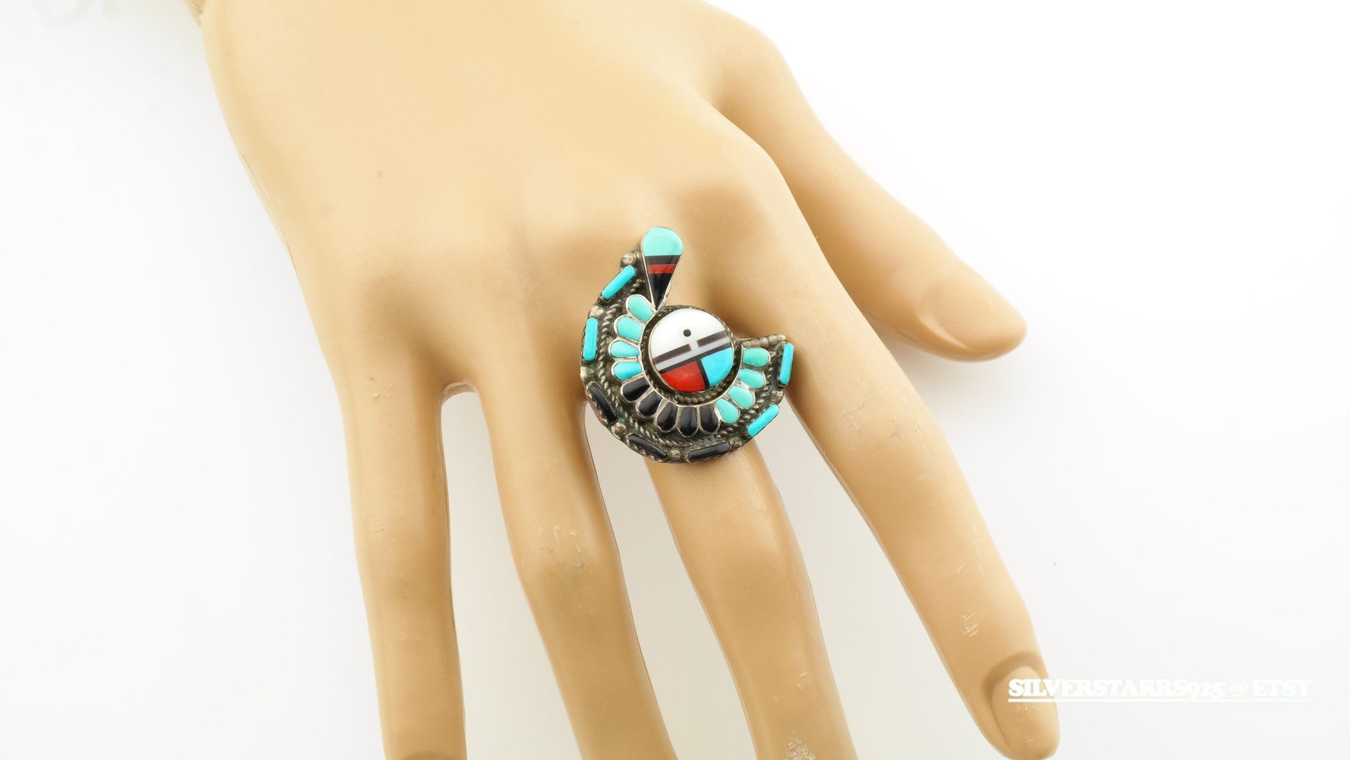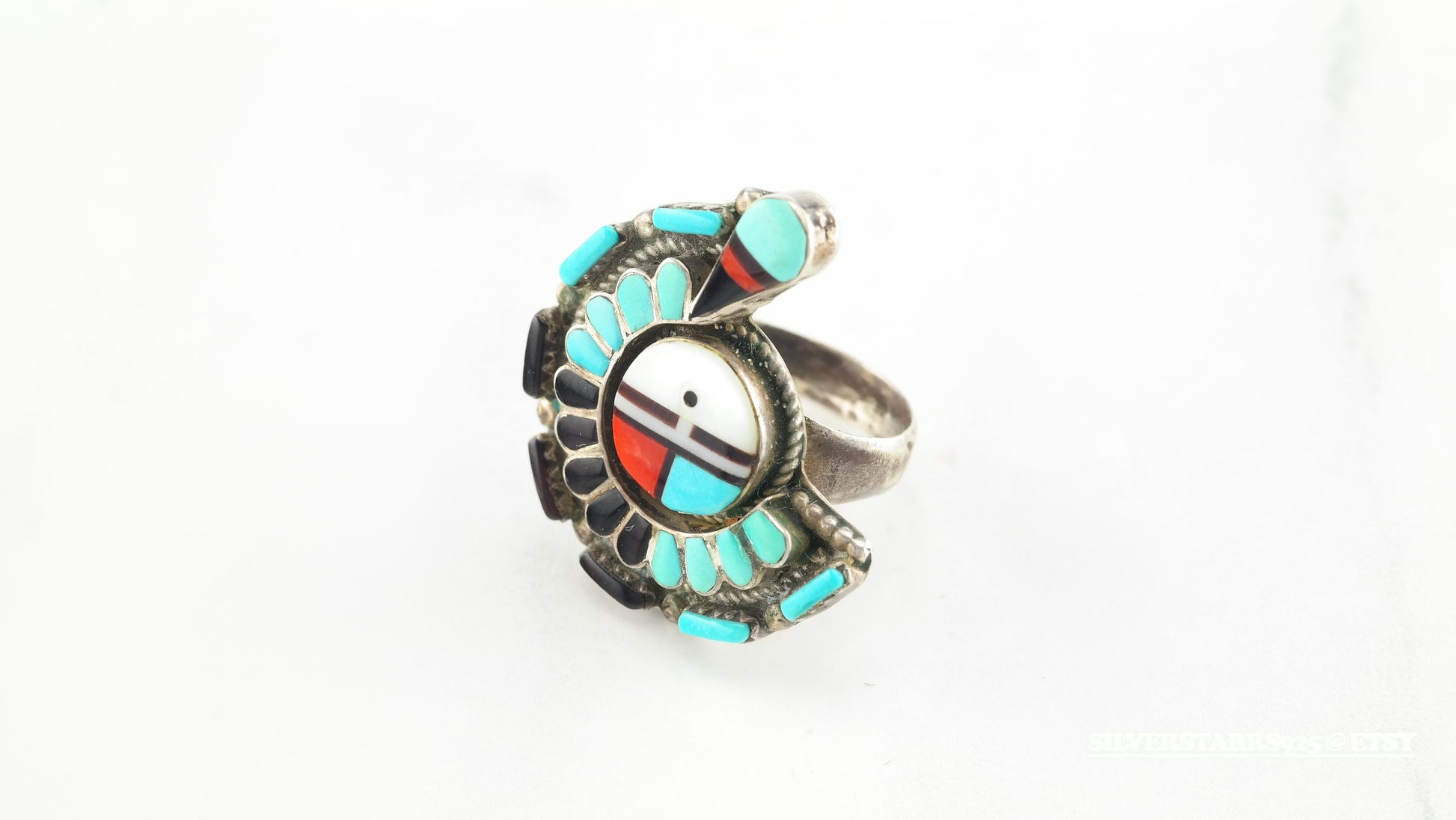 Vintage Zuni Sterling Silver Ring Size 8.25 Blue, White, Red, Black Turquoise Inlay