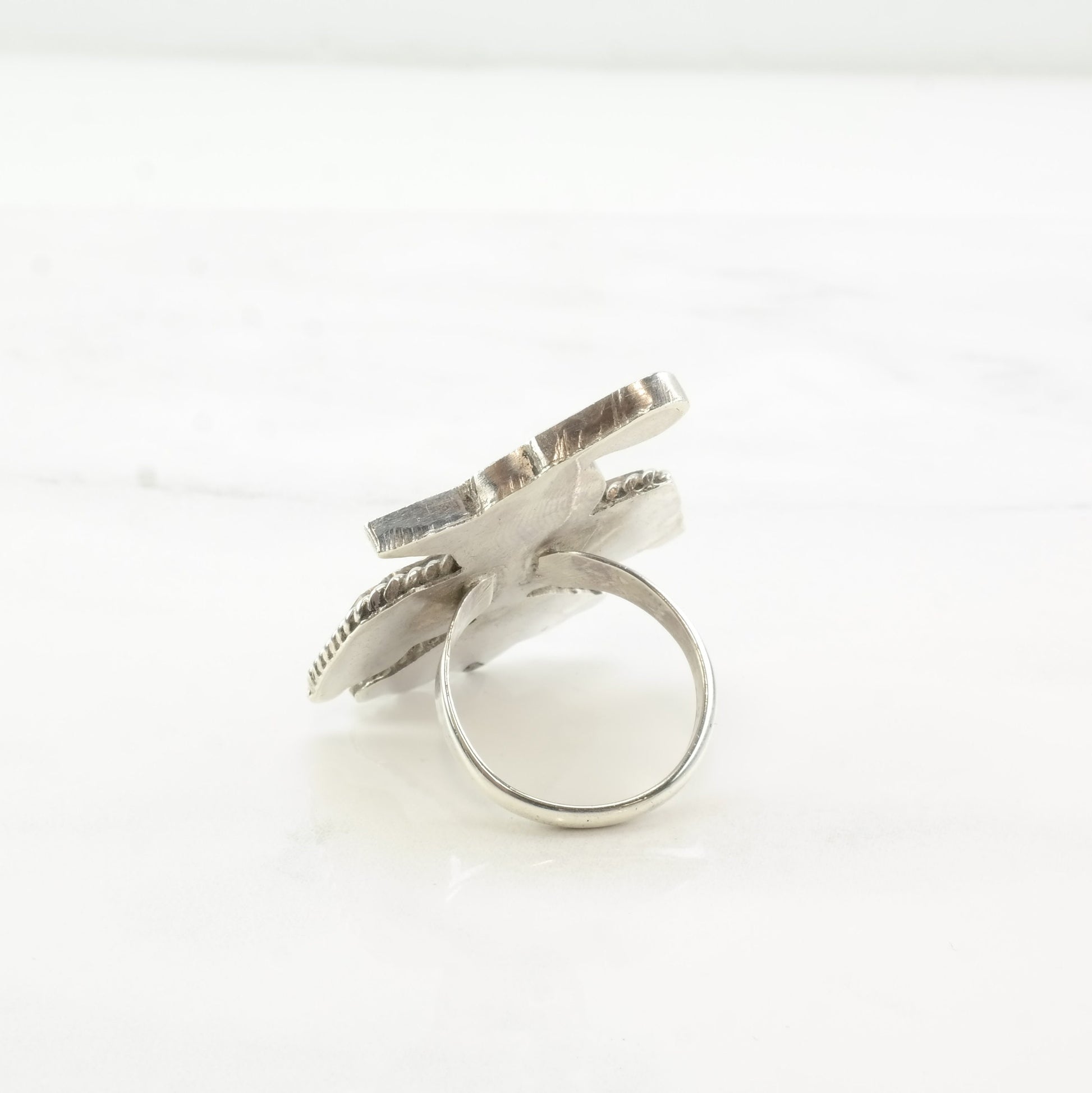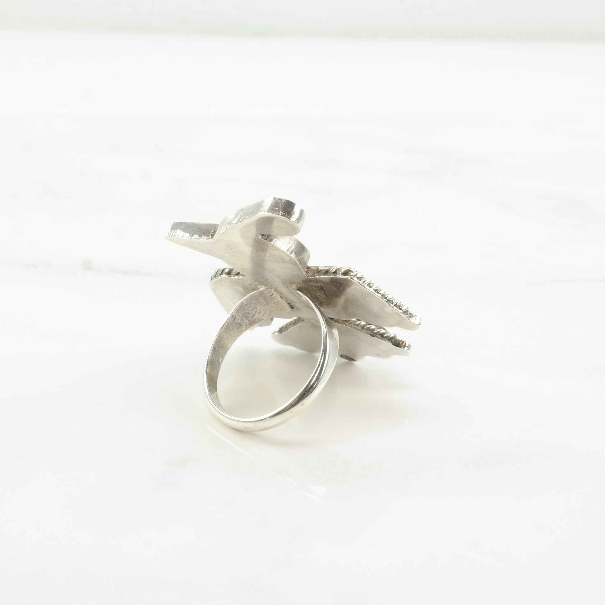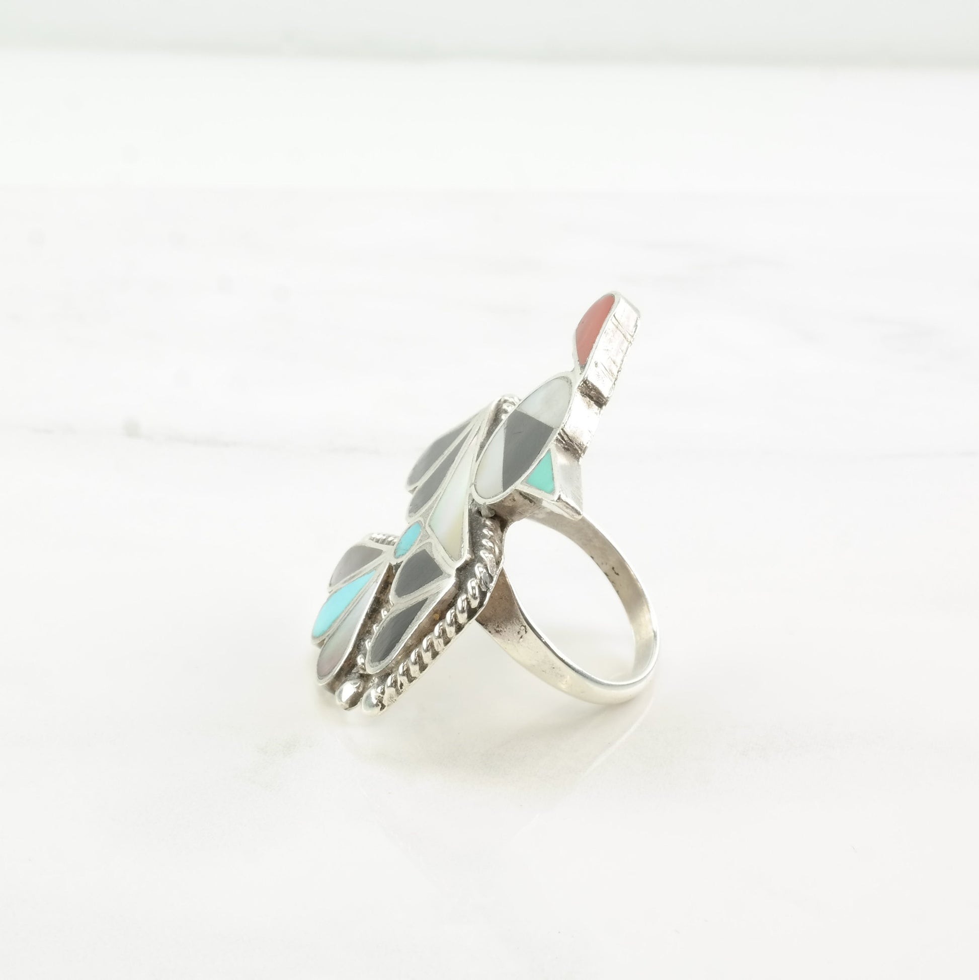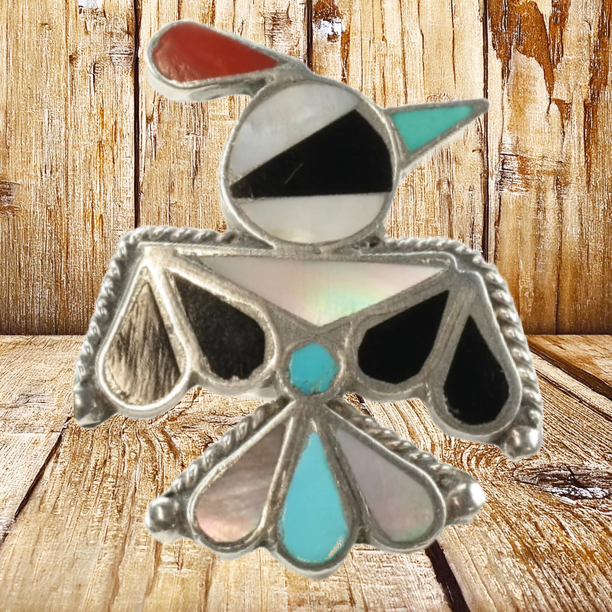 Vintage Zuni Sterling Silver Thunderbird Ring with Multi-Stone Inlay, Size 7, Attributed to Bobby Shack