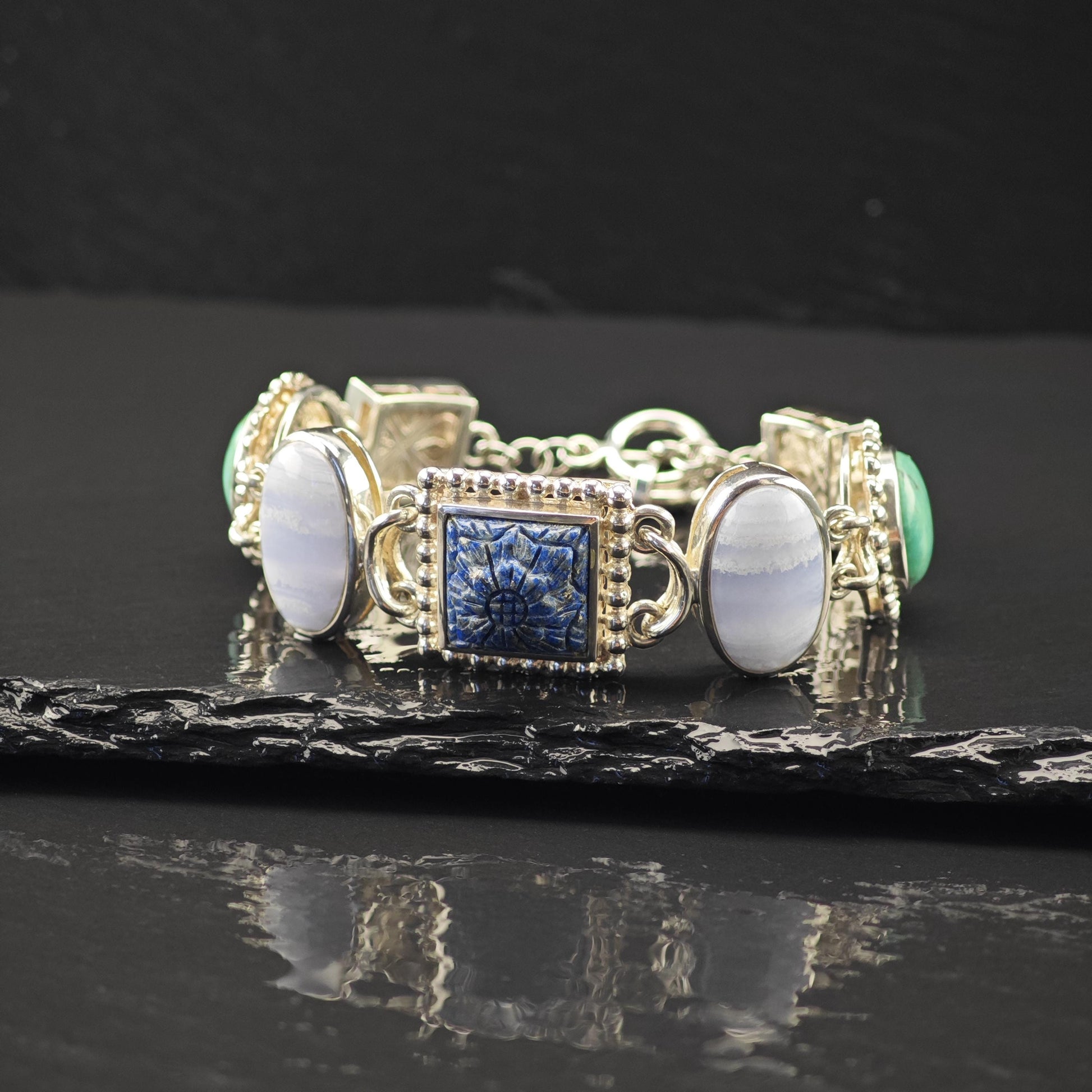 Discover the timeless elegance of this carved lapis bracelet, a stunning piece that beautifully blends vintage jewelry charm with the brilliance of 925 silver craftsmanship. Handcrafted with care, this sterling silver bracelet is designed to be adjustable, making it a perfect holiday gift or Christmas gift for someone special. The intricate link bracelet design showcases both artistry and versatility, ideal for those who appreciate classic style with a modern touch.