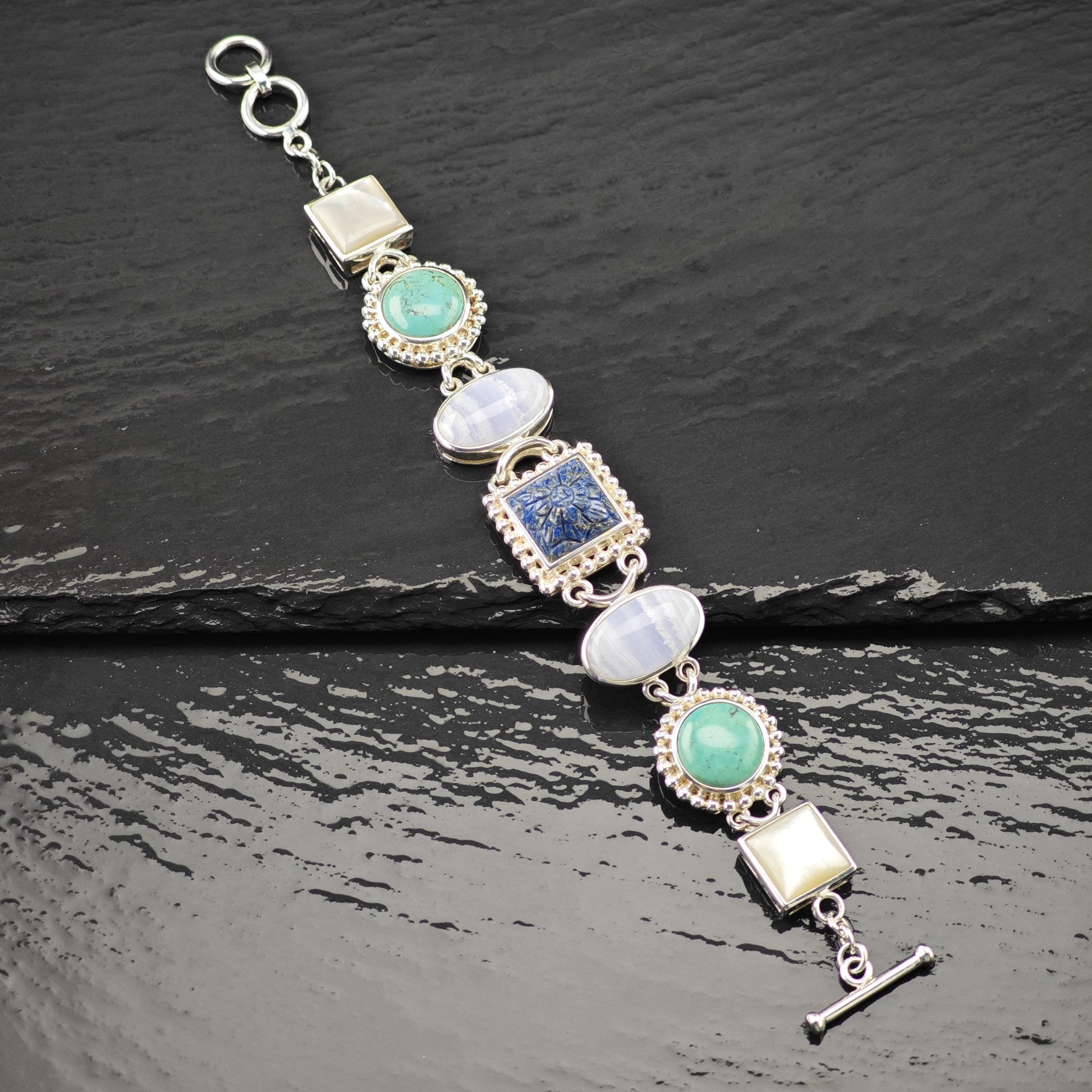- Crafted from genuine sterling silver (marked 925) with carved lapis stones and accents of turquoise and blue lace agate
