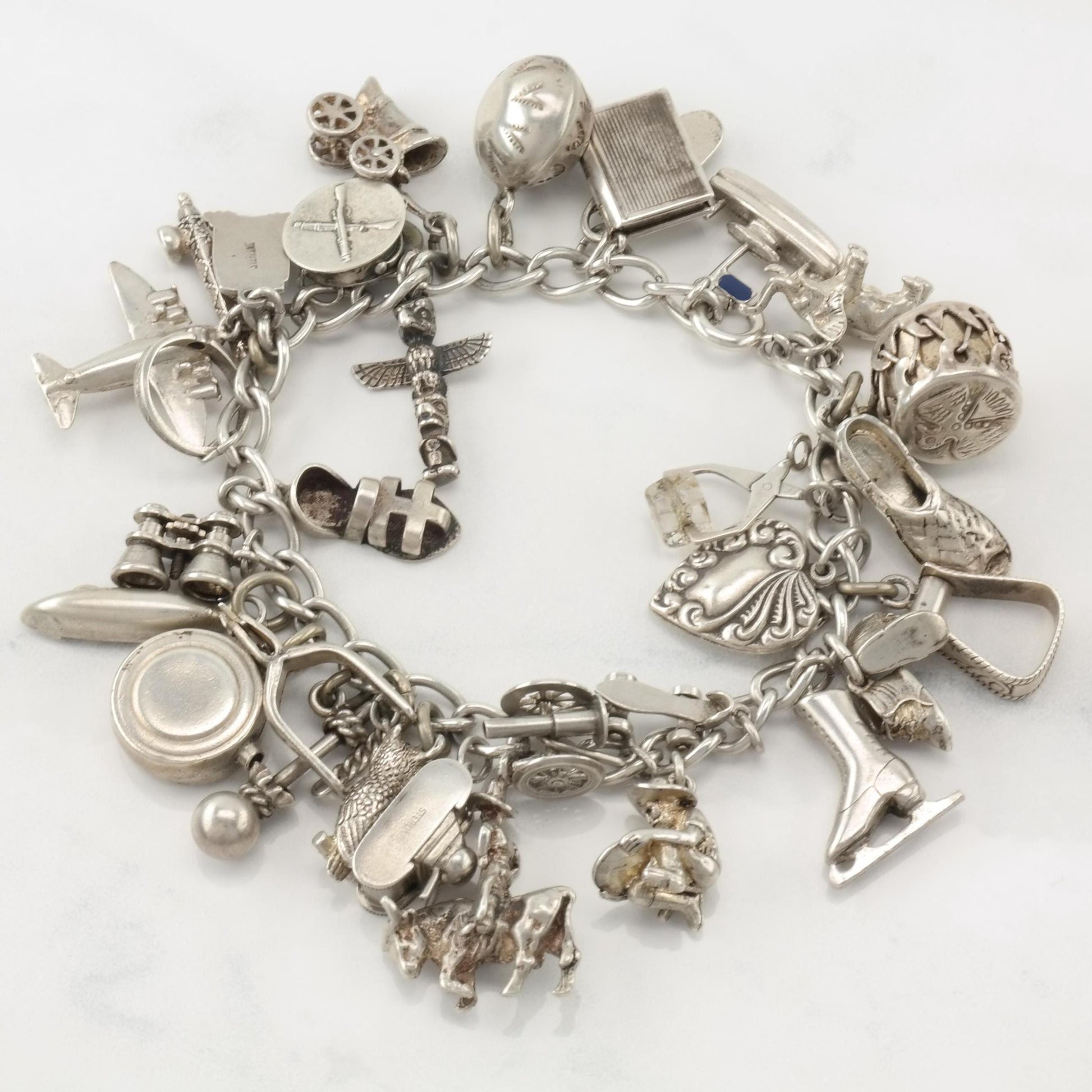 WWII Era Sterling Silver 32 Charms Bracelet Western, Military & Misc