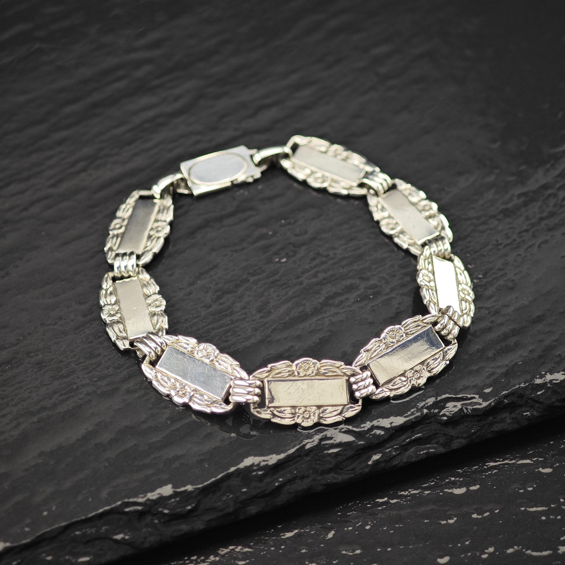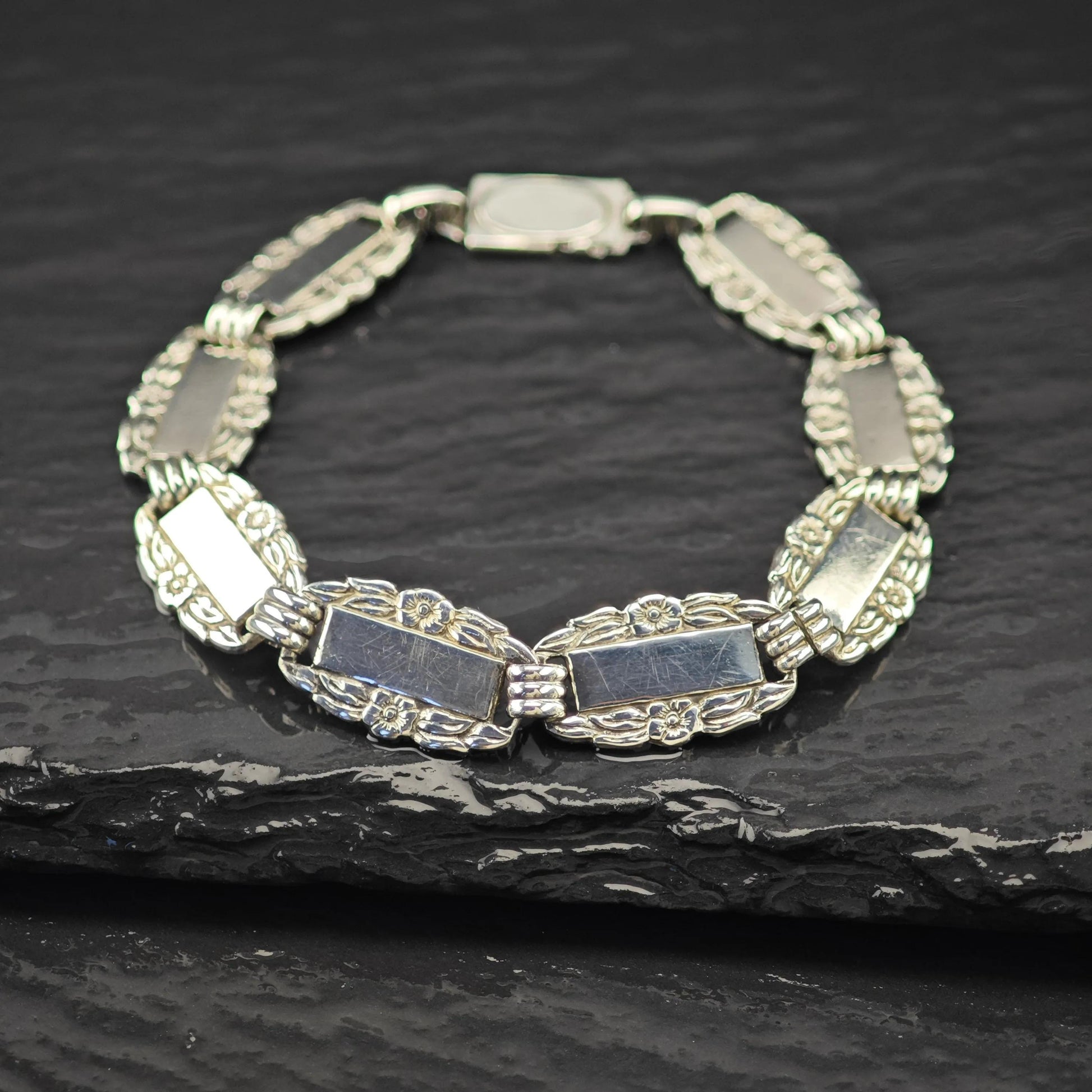 Discover the timeless charm of this sterling silver link bracelet, a beautiful piece of vintage jewelry inspired by the delicate Forget Me Not motif from WWII. Crafted in 925 silver, this bracelet carries a rich history and elegant design, perfect as a thoughtful holiday gift or a cherished addition to your collection. Its classic style and meaningful symbolism make it a standout piece for anyone who appreciates vintage bracelets.