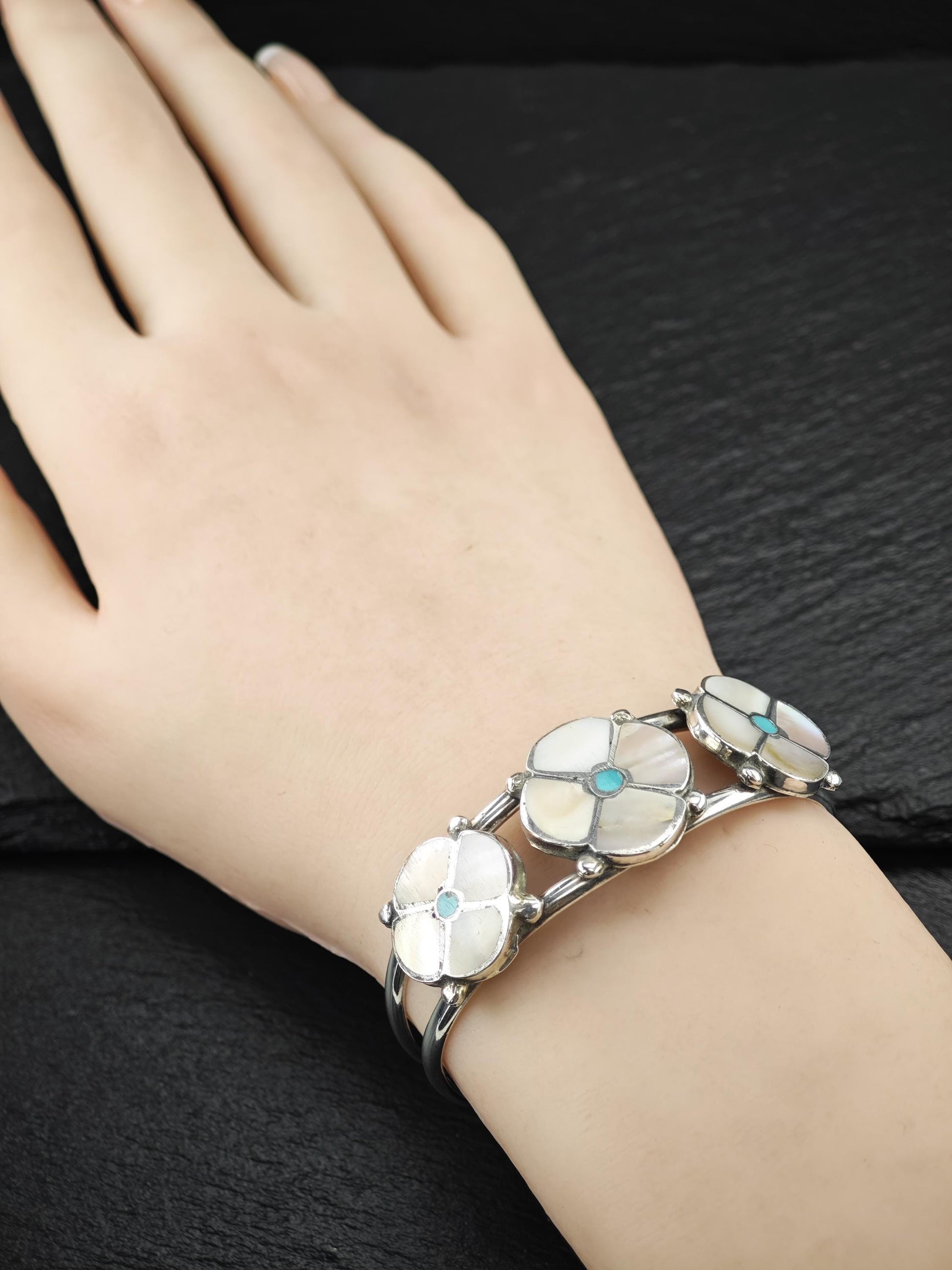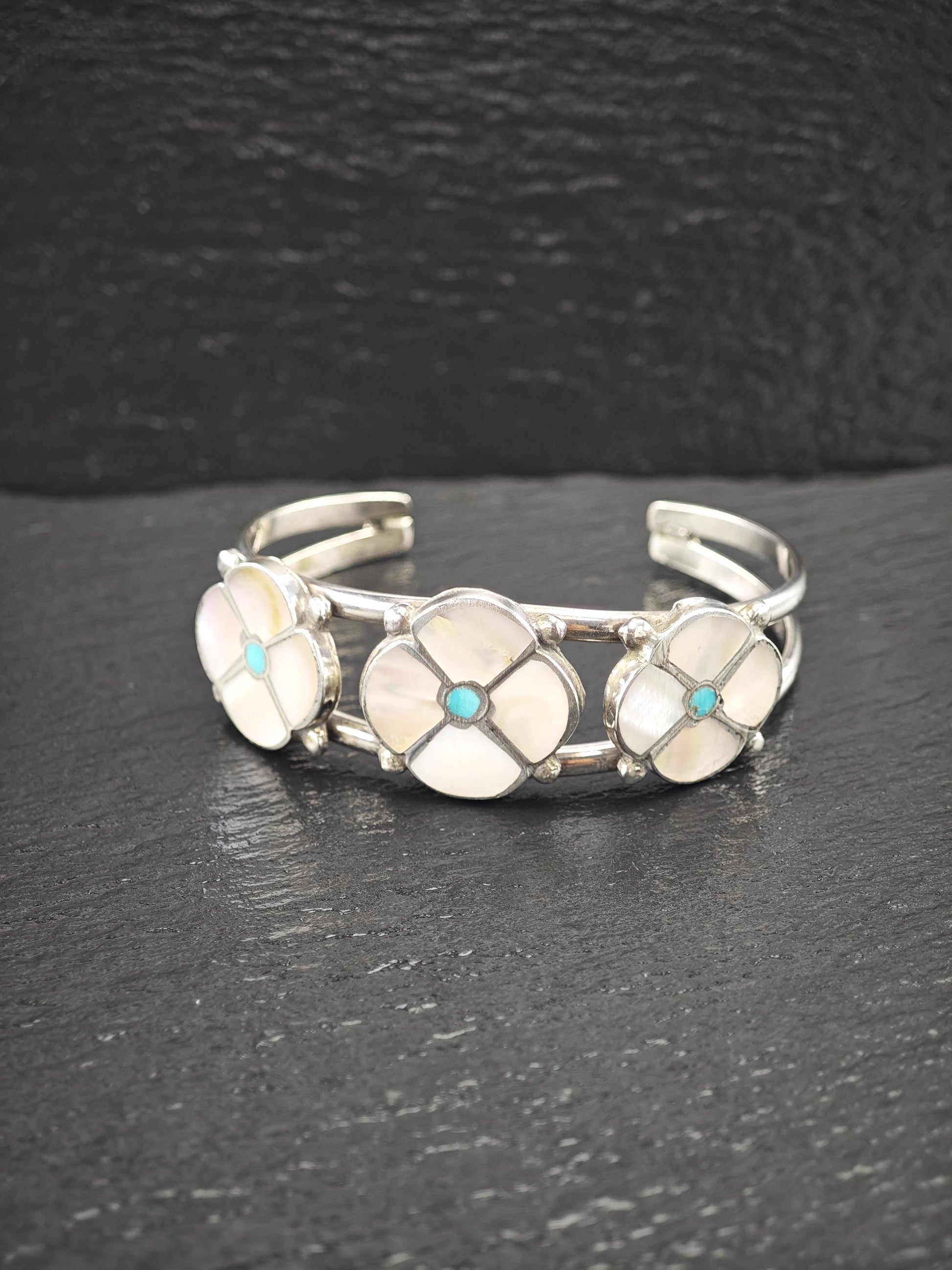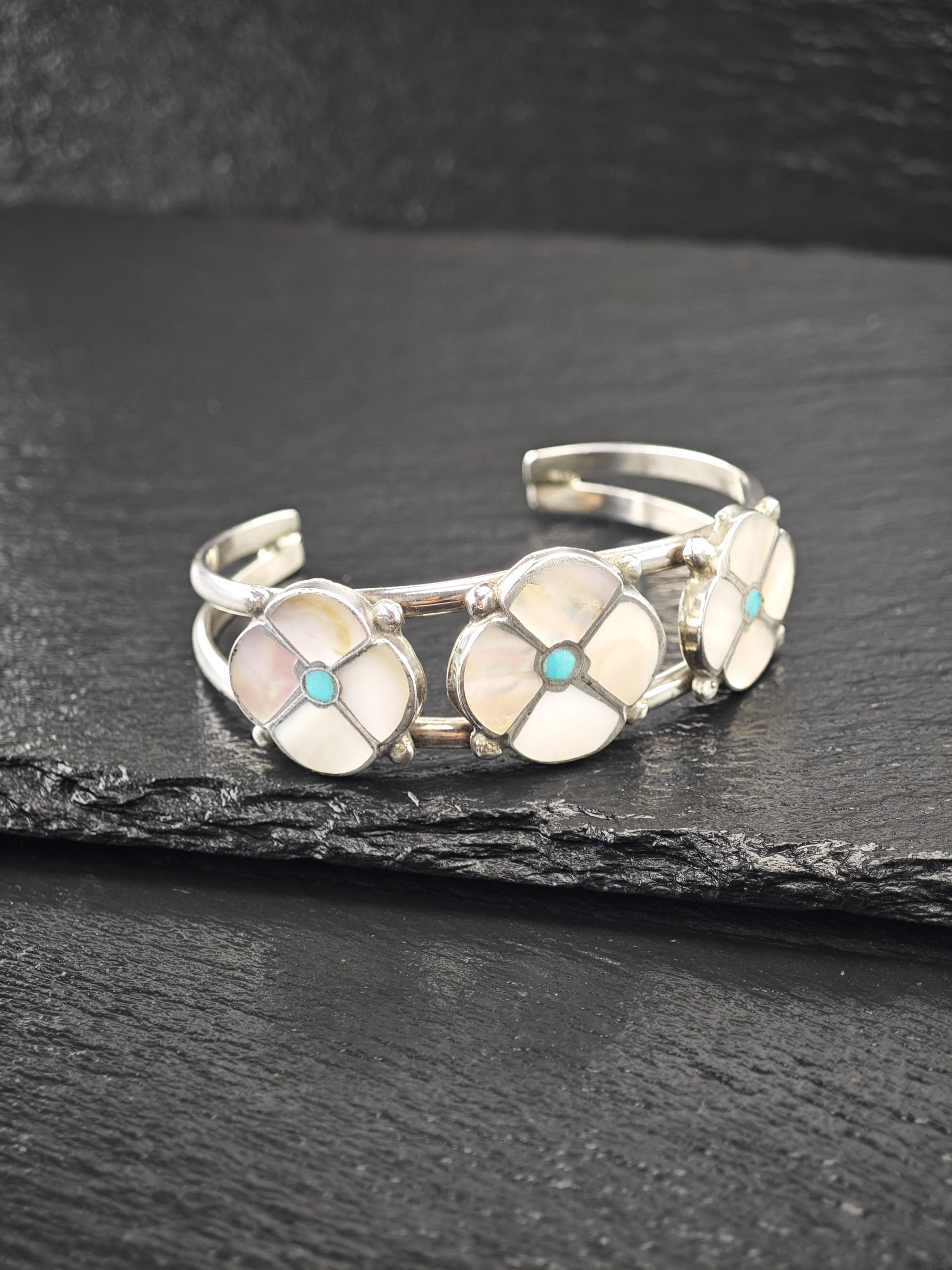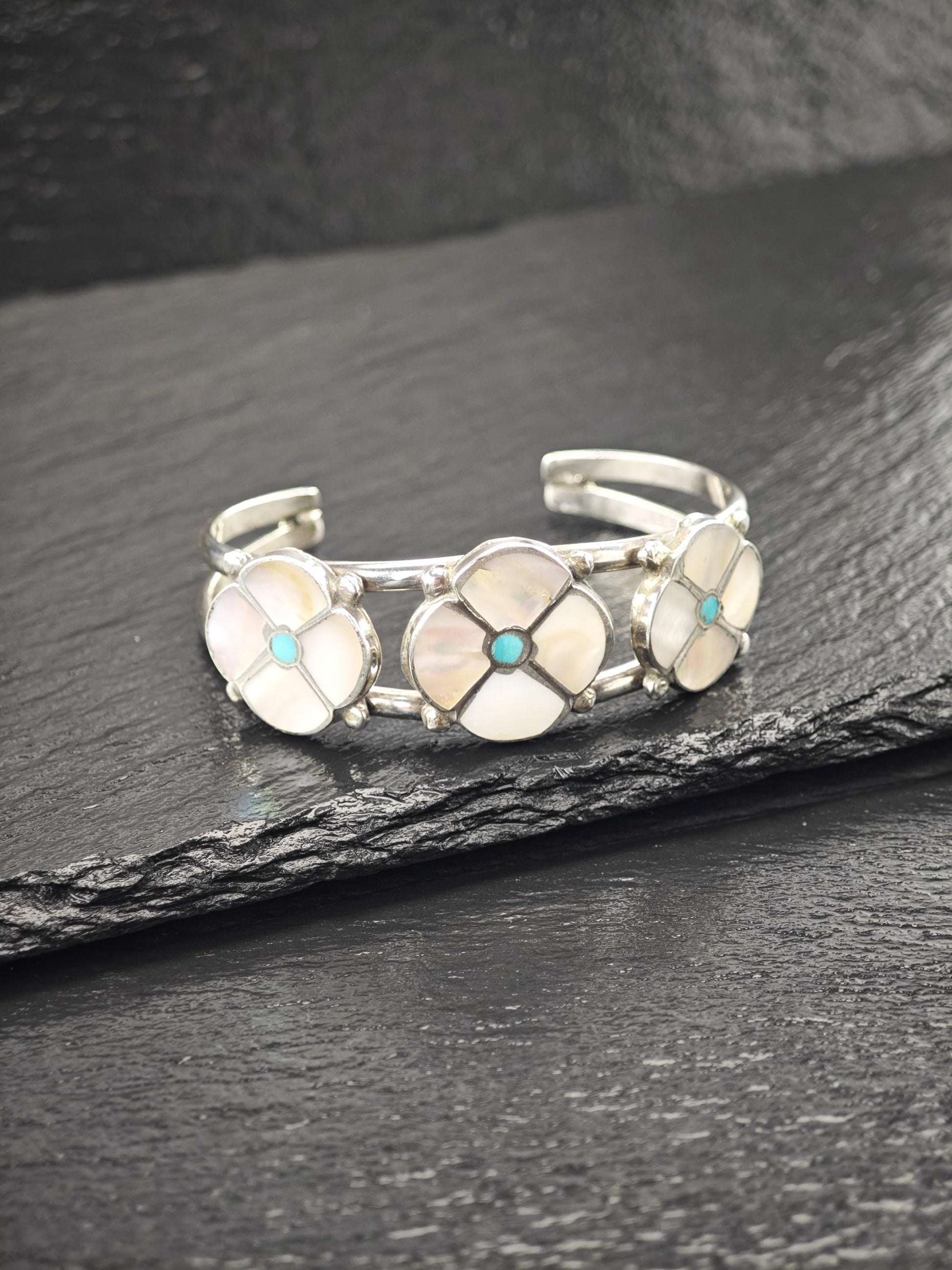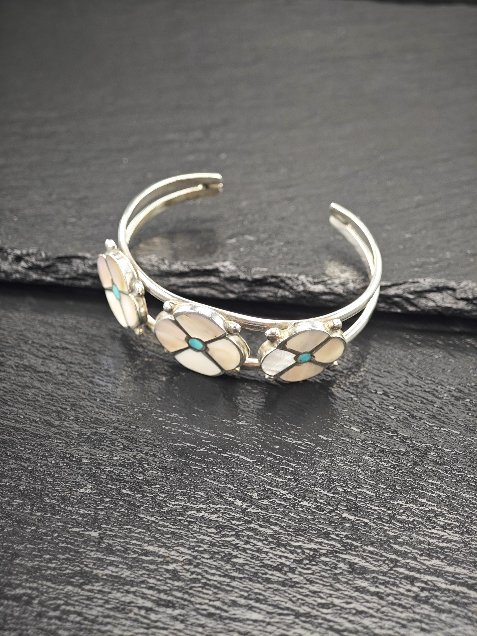 Vintage Zuni, Native American Turquoise MOP Flower Inlay Cuff Bracelet Sterling Silver