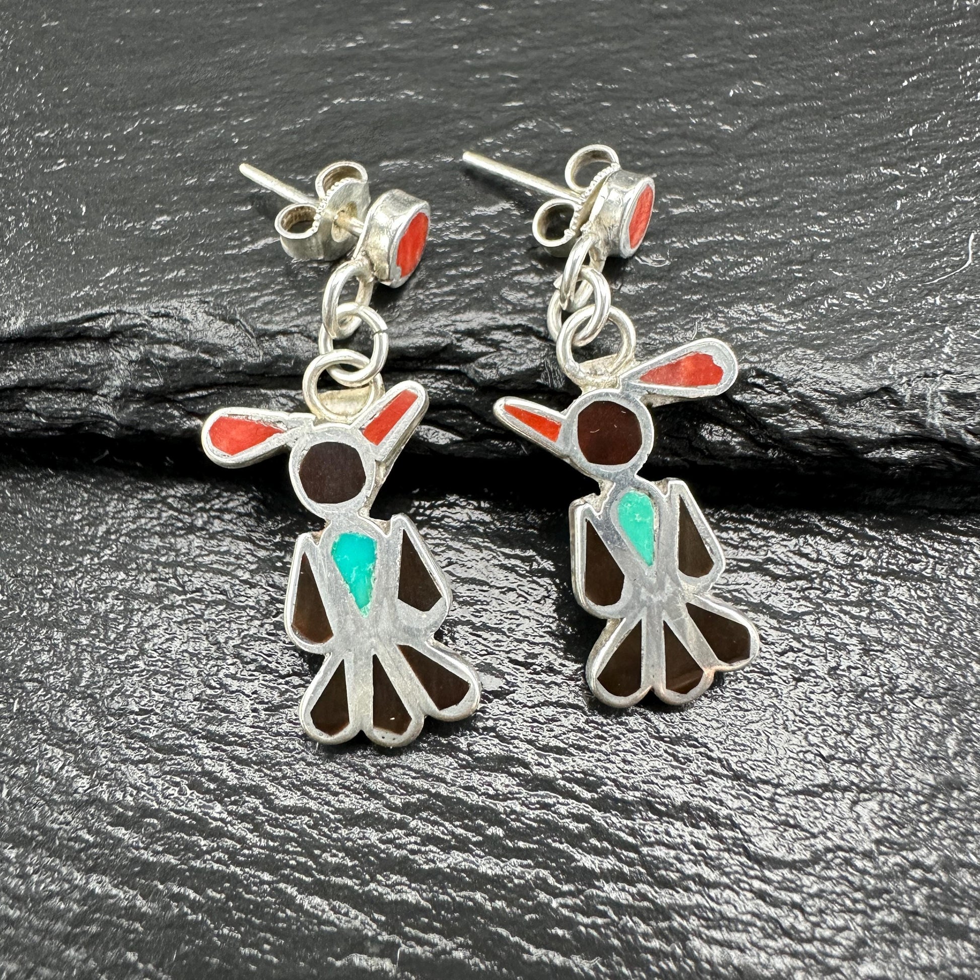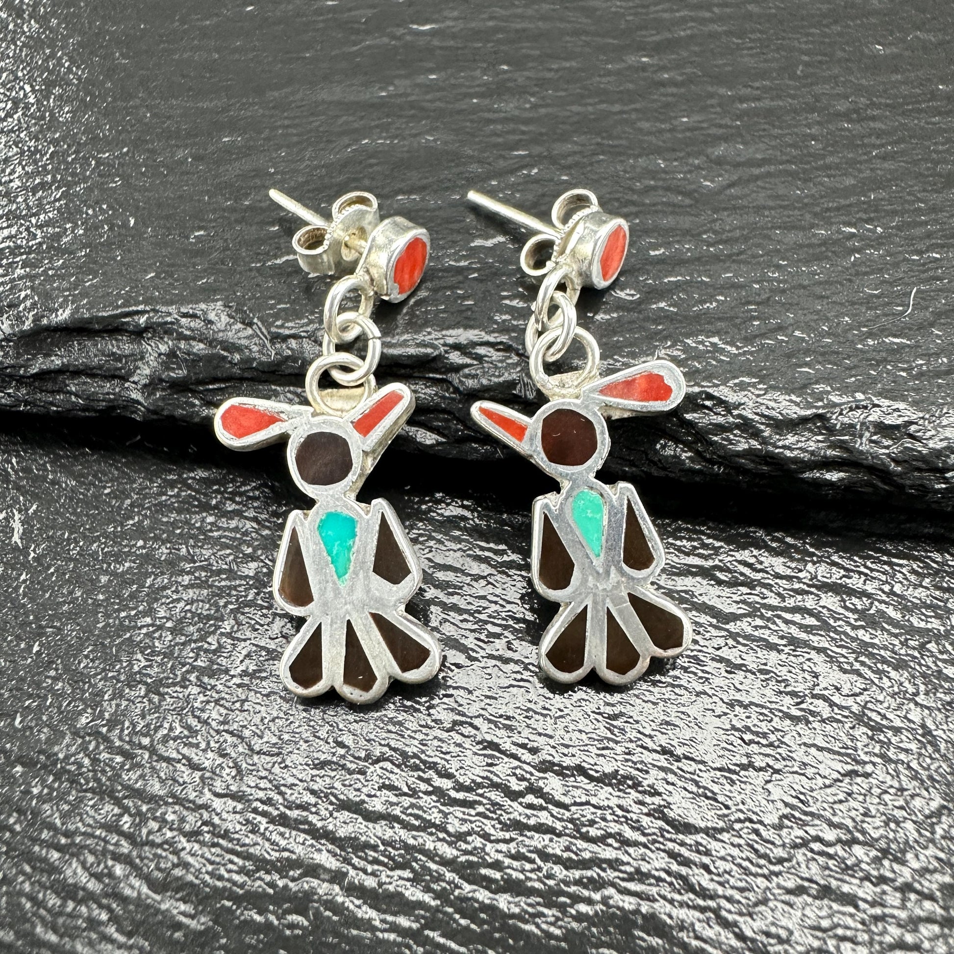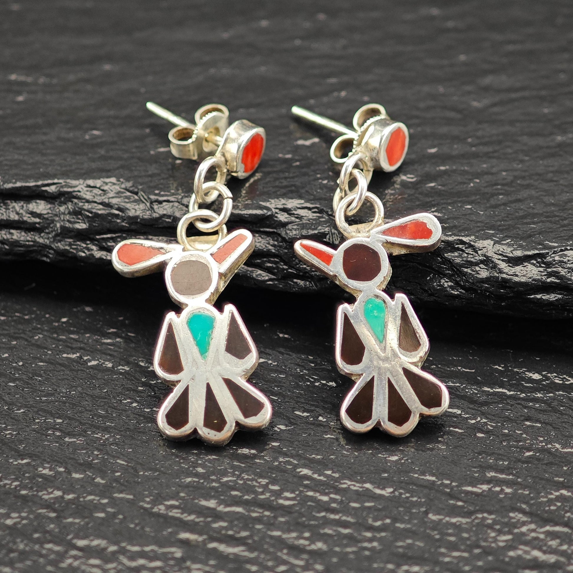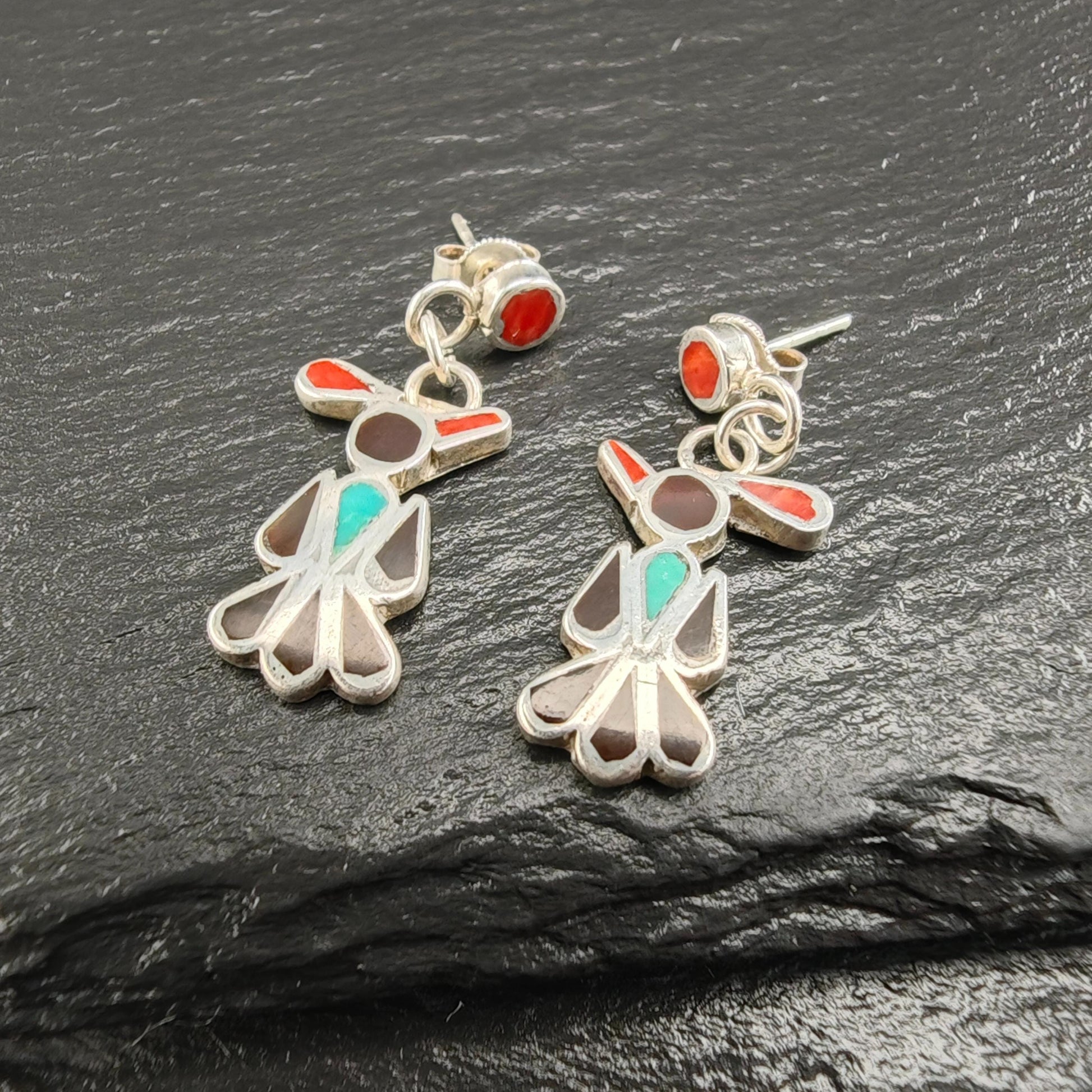 Zuni, Native American Inlay, Turquoise, Coral, Jet Thunderbird Stud/Dangle Earrings Sterling Silver