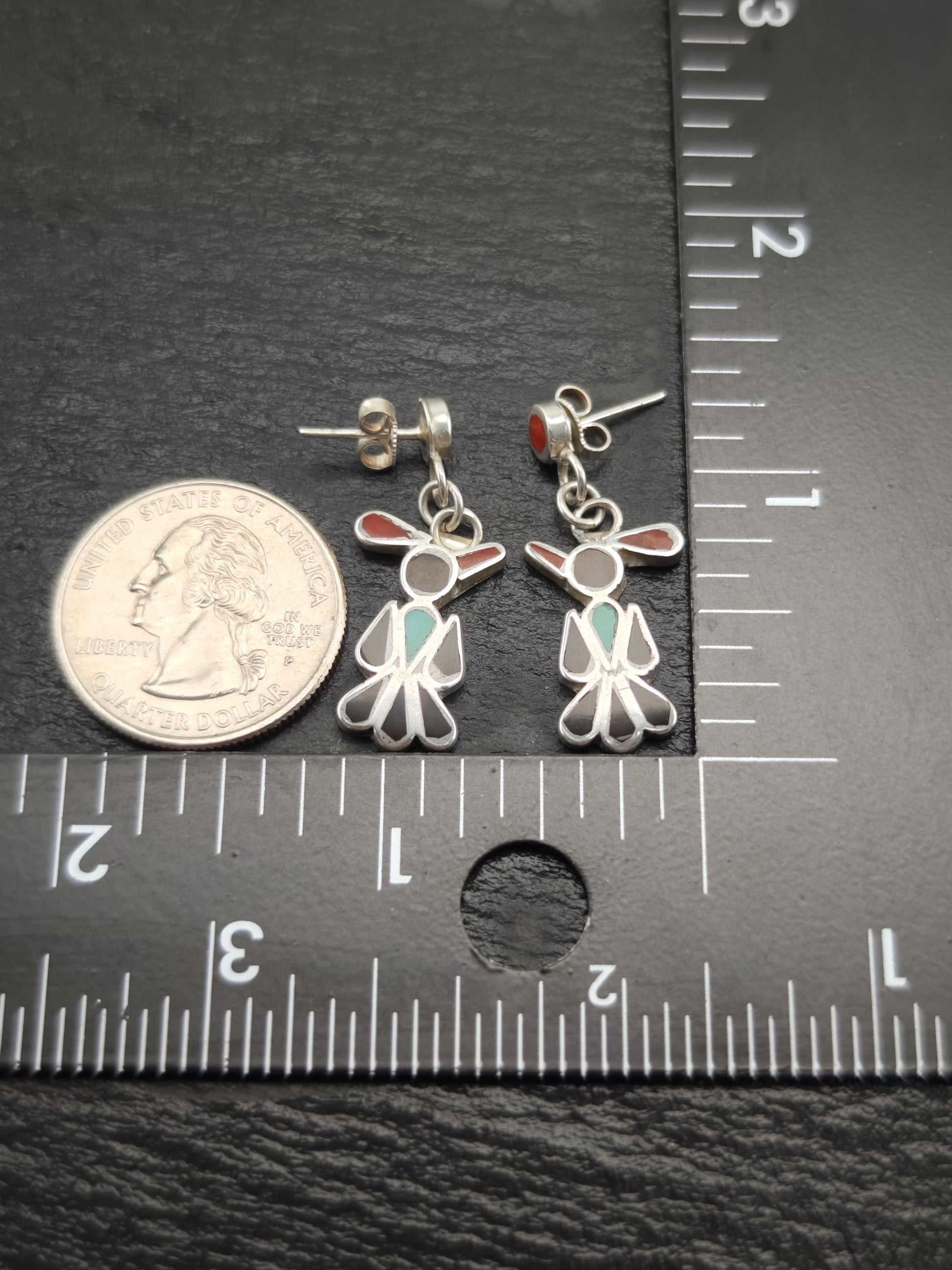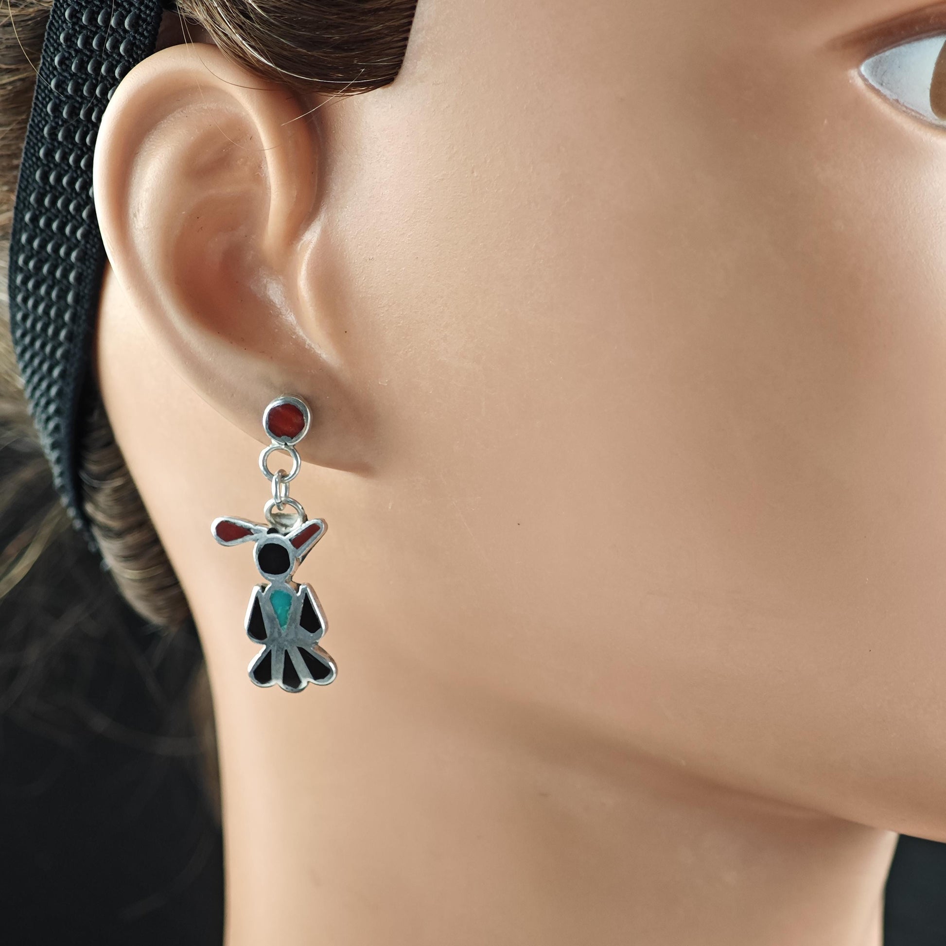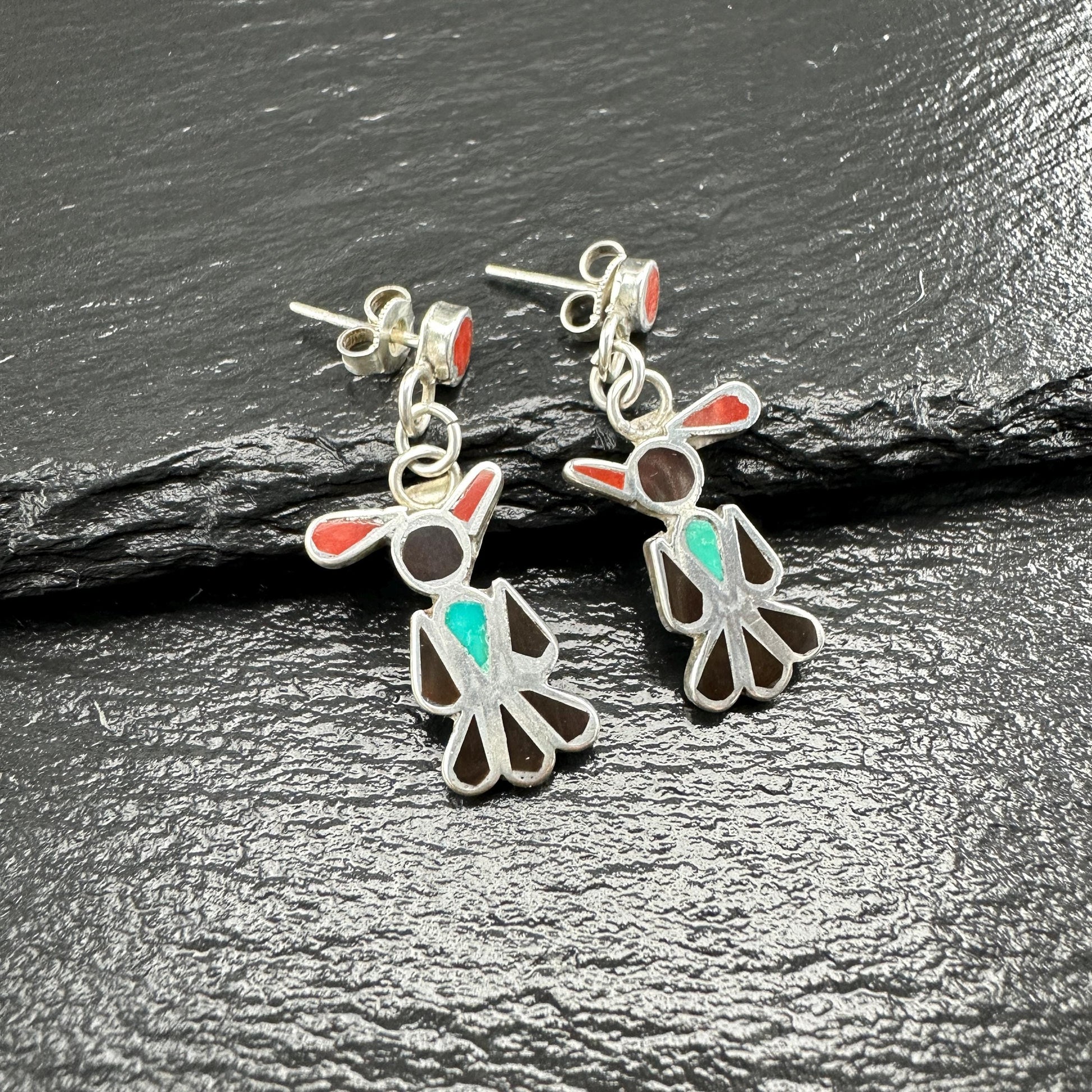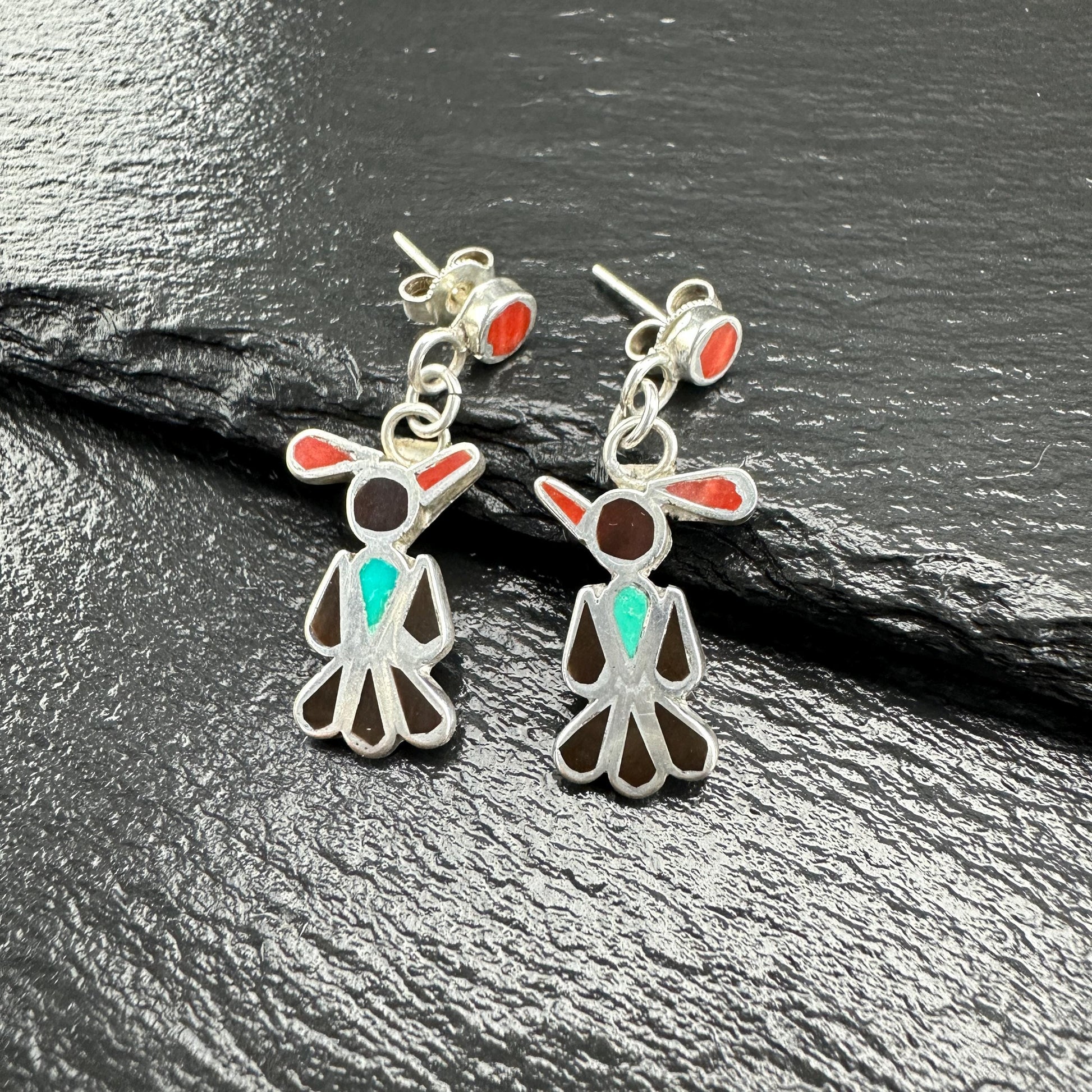 Zuni, Native American Inlay, Turquoise, Coral, Jet Thunderbird Stud/Dangle Earrings Sterling Silver