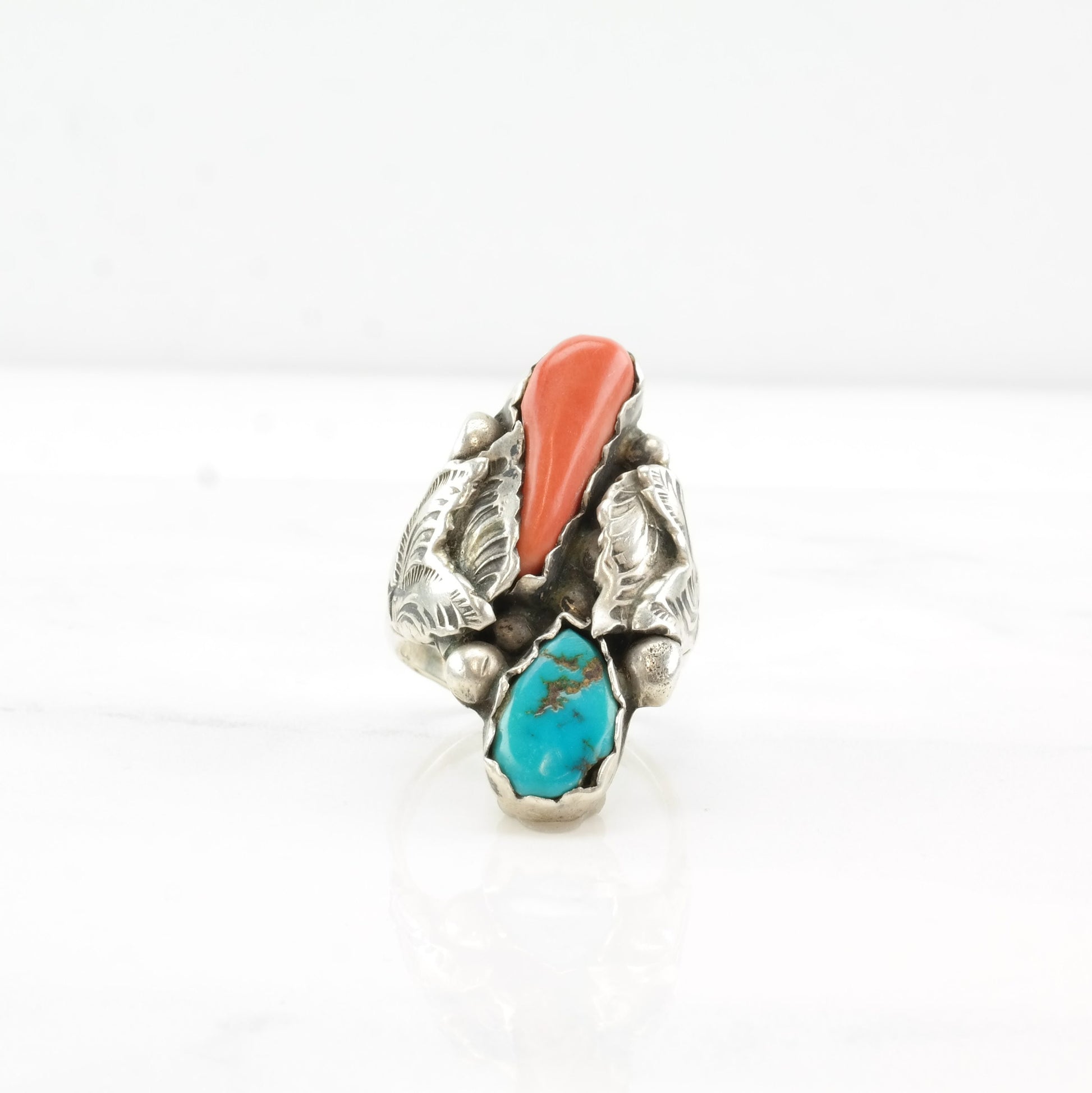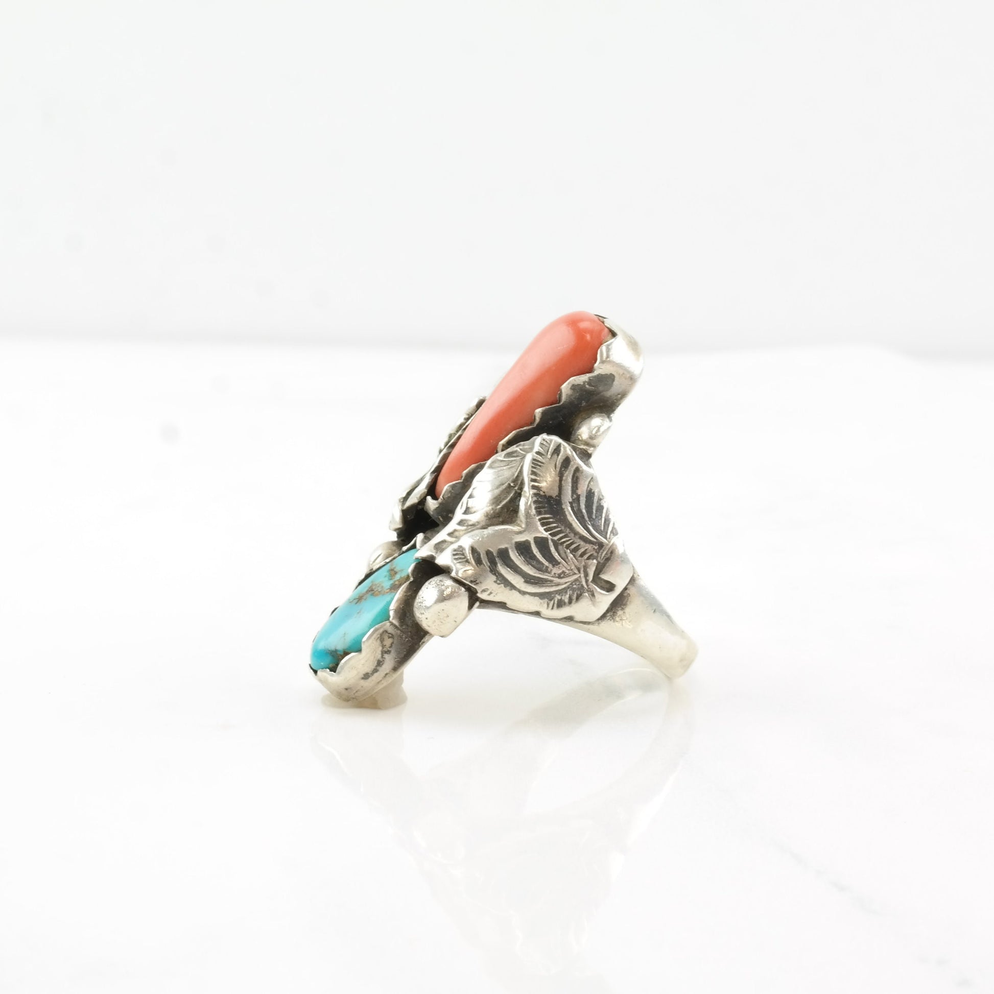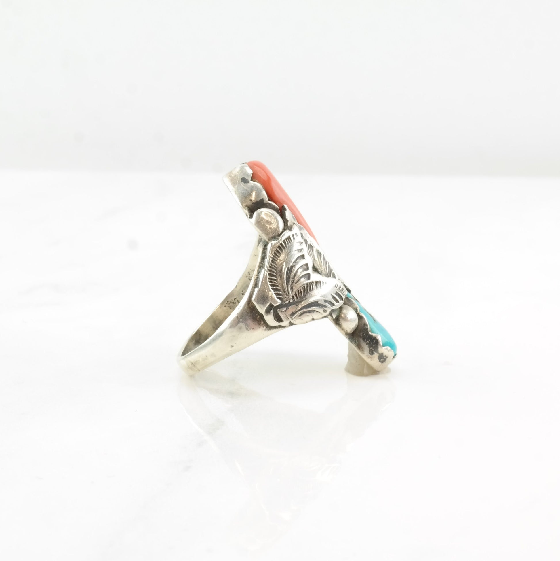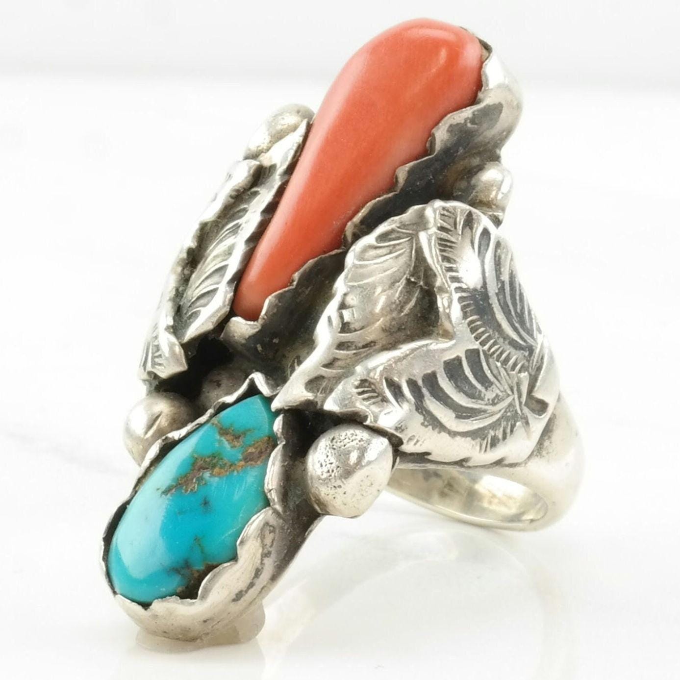 Zuni Sterling Silver Turquoise Coral Ring Native American